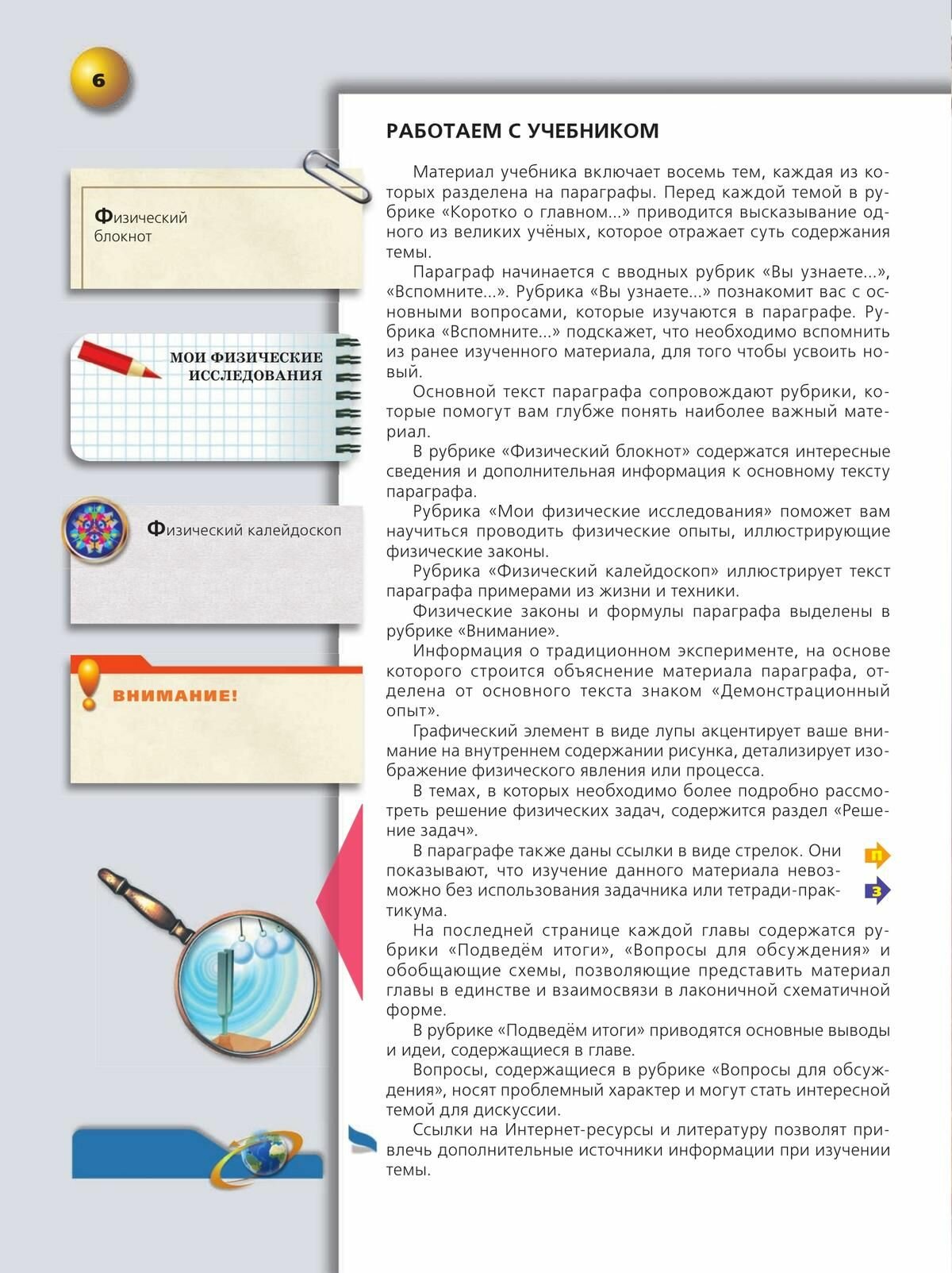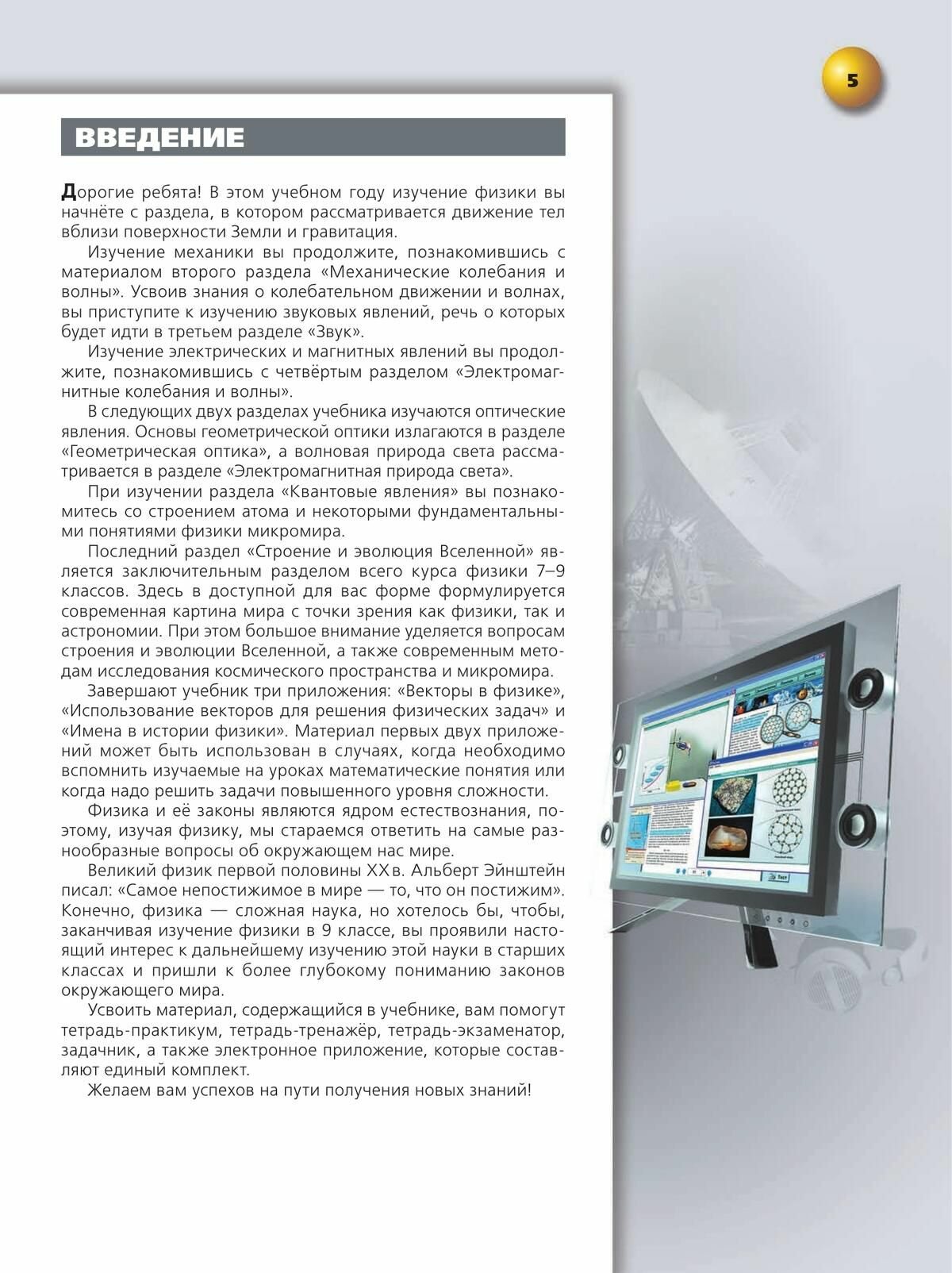 Данный учебник продолжает линию учебно-методических комплексов "Сферы" по физике. Издание подготовлено в соответствии с требованиями Федерального государственного образовательного стандарта основного общего образования и освещает вопросы курса физики для основной школы. Материал учебника направлен на формирование научных представлений о физических законах и явлениях и основывается на достижениях современной физики и техники. Главными особенностями данного учебника являются фиксированный в тематических разворотах формат, лаконичность и жёсткая структурированность текста, разнообразный иллюстративный ряд. Использование электронного приложения к учебнику позволит значительно расширить информацию (текстовую и визуальную) и научиться применять её при решении разнообразных физических задач и подготовке творческих работ.