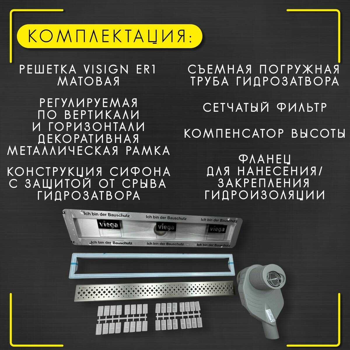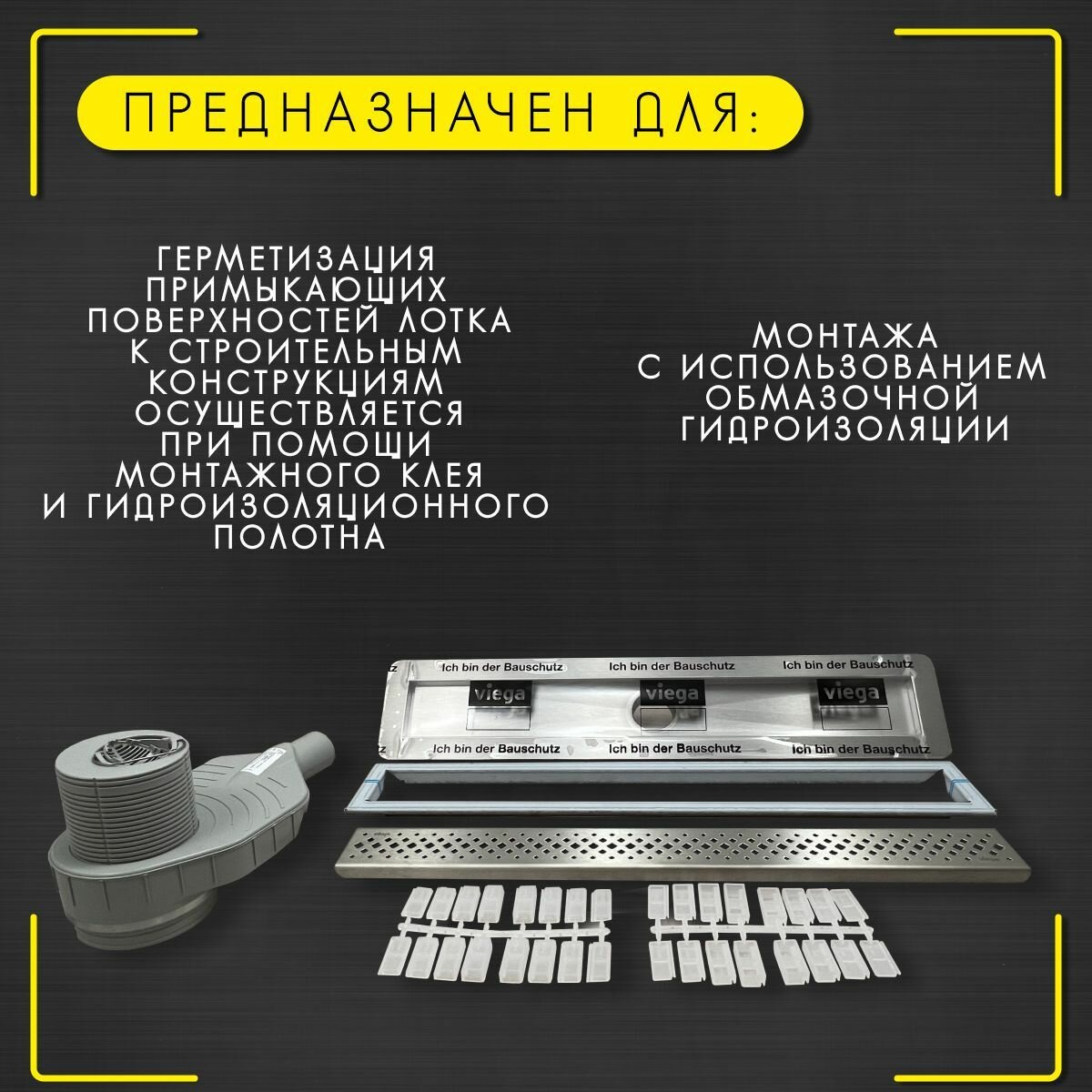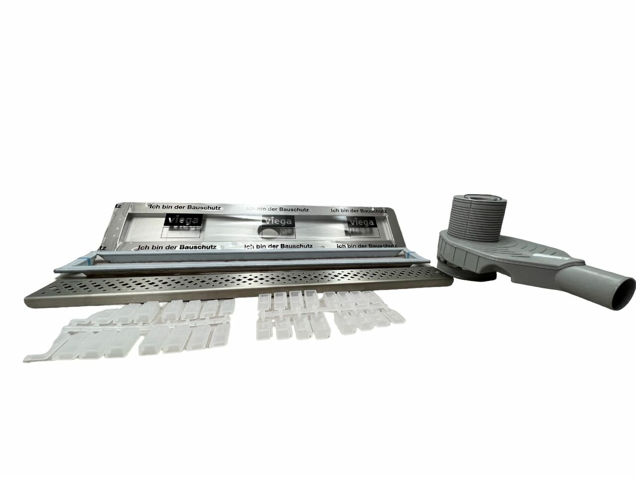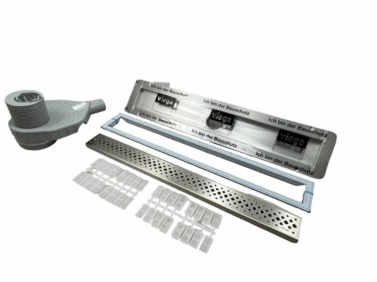 Душевой лоток Viega Advantix с сифоном и декоративной рамкой под решетку часть системы инсталляции для ванной комнаты, которая образует на полу ванной слив сточных вод, что позволяет обойтись без душевого поддона. Представляет собой небольшой канал, который закрывается декоративной решеткой. При установке лотка на поверхности пола образуется щель для отвода воды. Трап-лоток – продуманная блочная система для ванной и напольной канализации. Конструкция обеспечивает надежный отвод воды из душа и обеспечивает разделение пола на влажную и сухую зоны. Душевой лоток имеет высокую пропускную способность. Конструкция сифона снабжена защитой от срыва гидрозатвора, регулируемая высота столба жидкости гидрозатвора в пределах 35–50 мм. Фильтр легкодоступен для прочистки. Поверхность для установки решетки сделана из пластика, штампованная решетка из нержавеющей стали. Решетка может быть отрегулирована по высоте и по горизонтали. Трап устанавливается в уровень плитки и придает эстетичность душевой комнате, внешний вид решеток впишется в любой интерьер.
