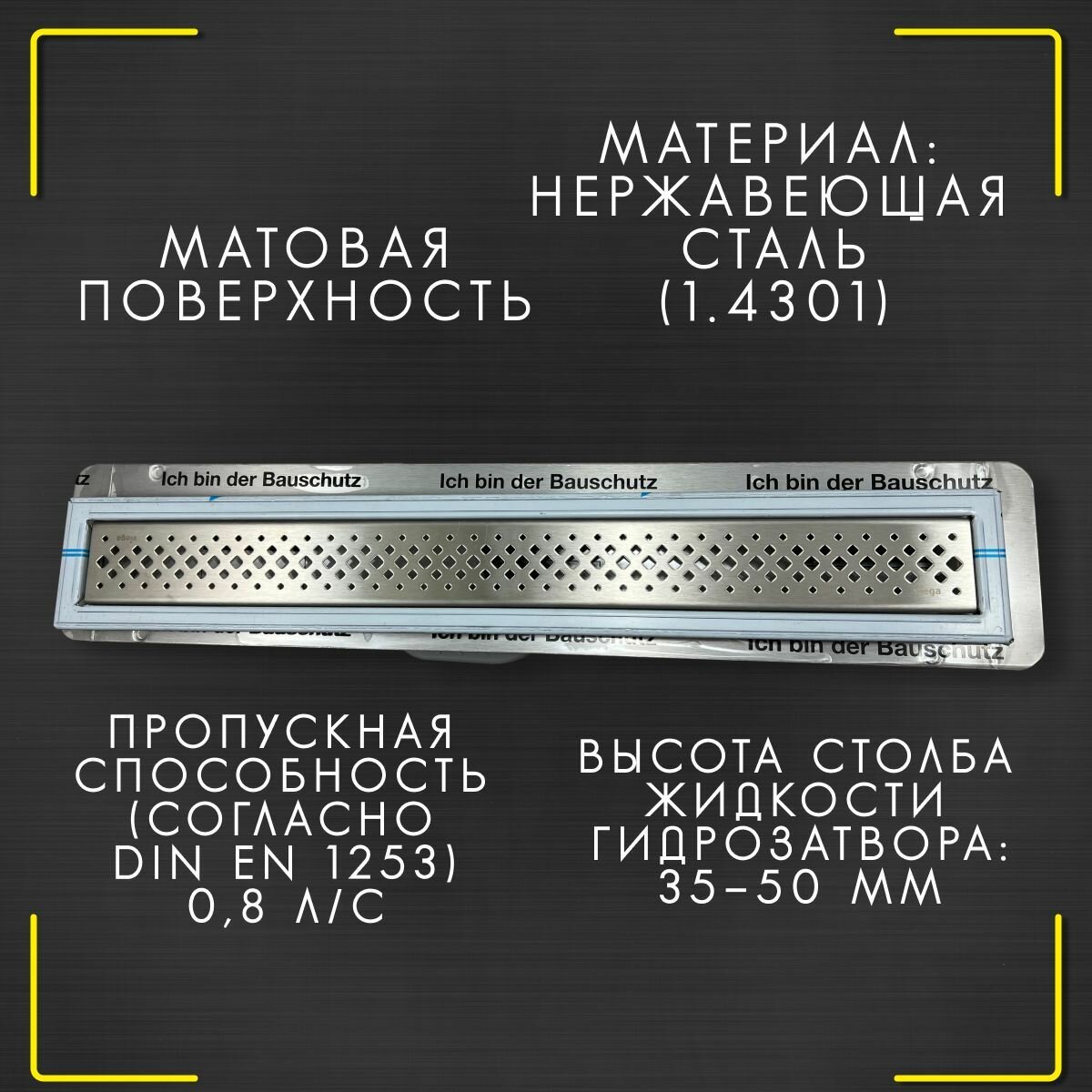 | Комплект поставки | решетка слива, сифон, рама, сетчатый фильтр |