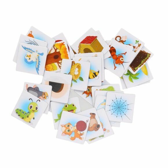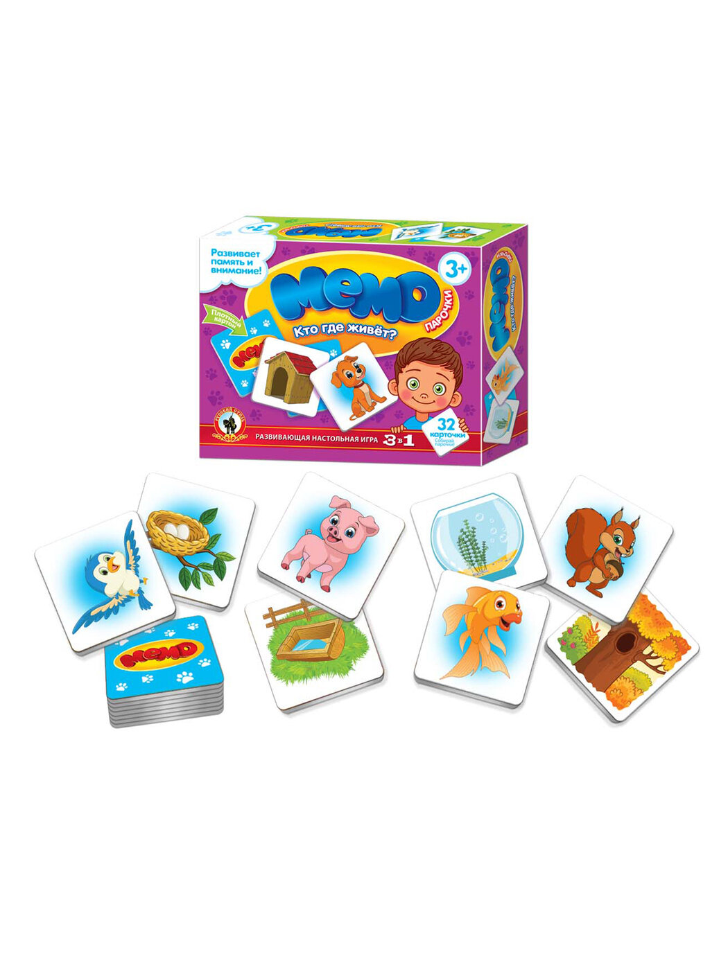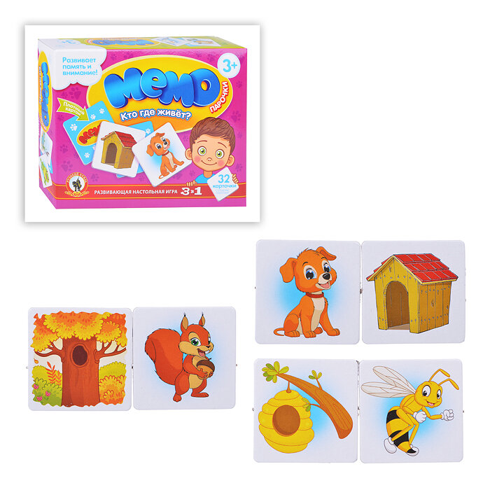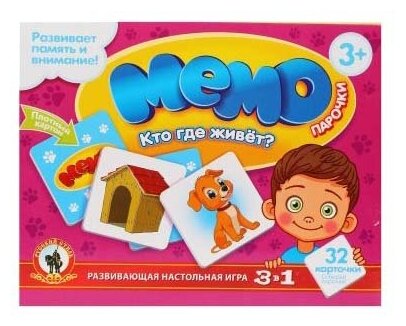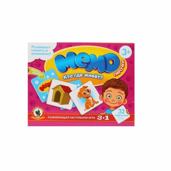 Развивающая настольная игра Парочки. Кто где живёт? из серии Мемо включает 16 пар карточек с красочными изображениями животных или насекомых и домиков, а также правила. Играть в неё интересно и очень полезно для тренировки памяти и способности концентрировать внимание. Карточки выполнены из толстого картона, их будет удобно держать в ручках даже самым маленьким игрокам. В правилах описано несколько вариантов игры.