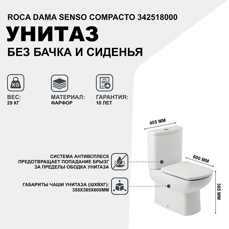 Комплетация: Чаша Roca Dama Senso Compacto напольная, с установочным комплектом. Бочок и сиденье приобретаются отдельно.