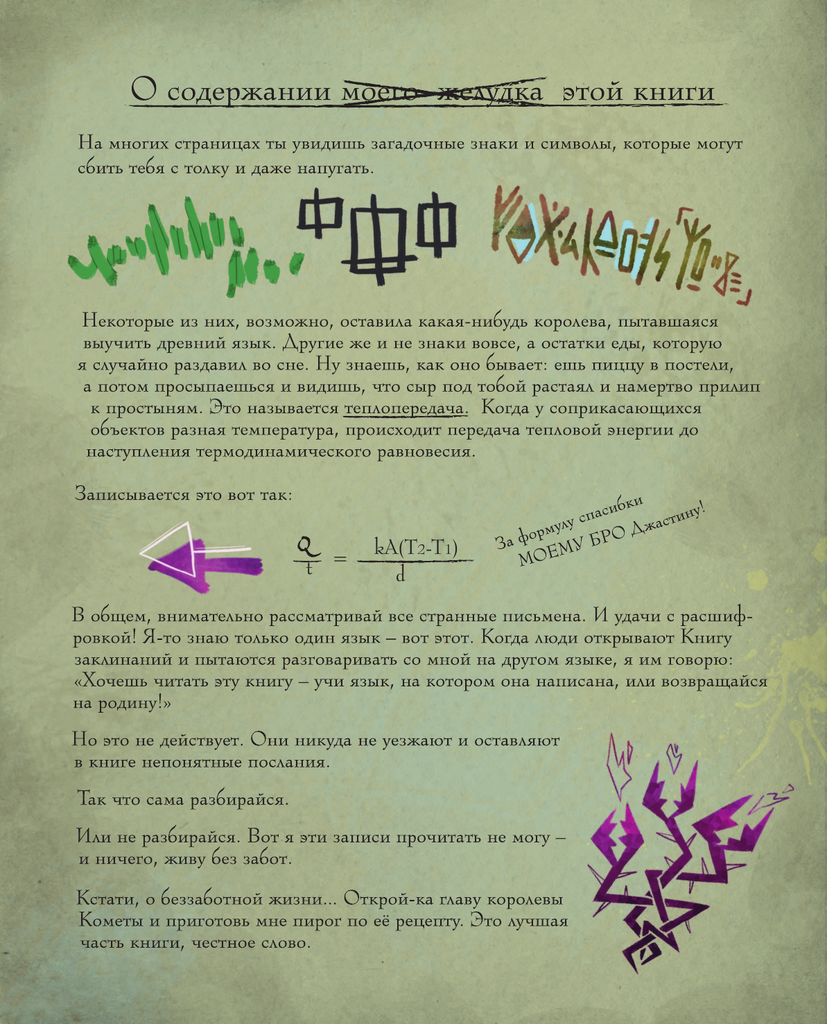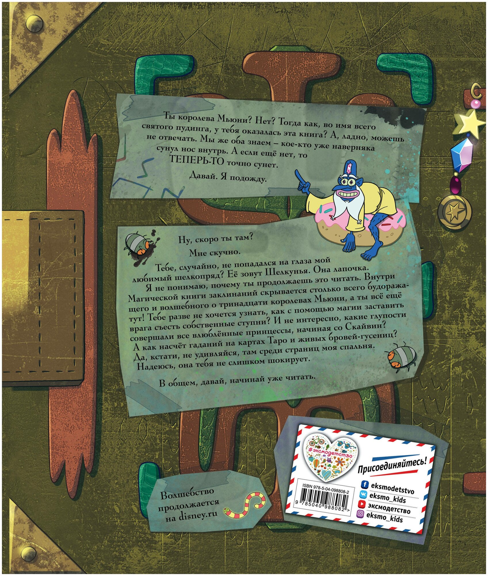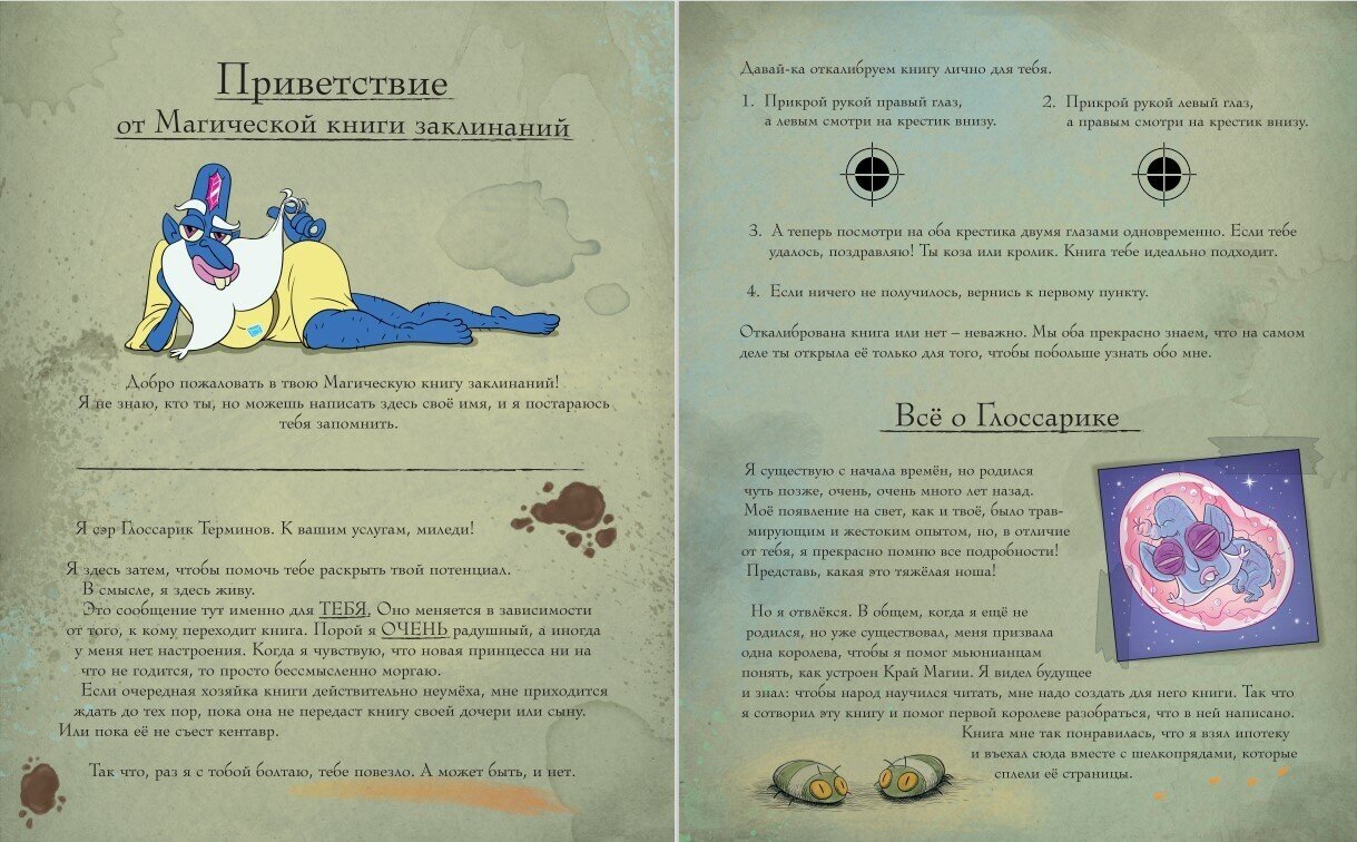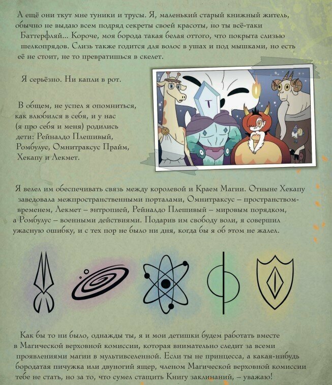 Книга просто замечательная! Шрифты очень красивые, имитирующие почерки разных королев, много всего интересного о прошлом волшебной страны и о Звёздочке, её маме Луне и Эклипсе. В главе Диргении очень забавная ссылка - перейдите по ней обязательно. Вообще в книге много всего прикольного - настоящие рецепты коктейлей и пирогов, песня которую можно сыграть по нотам (на ютюбе, кстати, есть запись), карты Таро, которые можно вырезать и погадать на суперобложке (очень здорово, я даже попробовала))). А ещё там шифры!!!! И есть подсказки, чтобы шифры разгадать! В главе у Луны очень загадочные послания, явно связаны с концом последнего сезона. Да, и на обложке тоже шифр!
