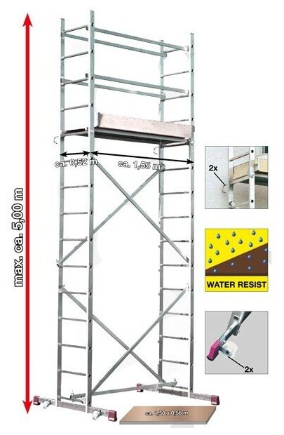 Универсальная рабочая платформа. Собирается легко и быстро без инструмента. Максимальная рабочая высота 5 м.