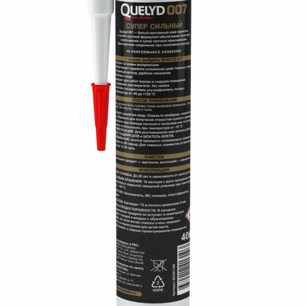 QUELYD 007 Супер Сильный Высококачественный гибридный клей с высокой силой начального схватывания на основе SMP-полимера для влажных помещений. Используется для эластичного склеивания и герметизации при монтажных и отделочных работах внутри и снаружи помещений. Совместим с большинством материалов в любых комбинациях.