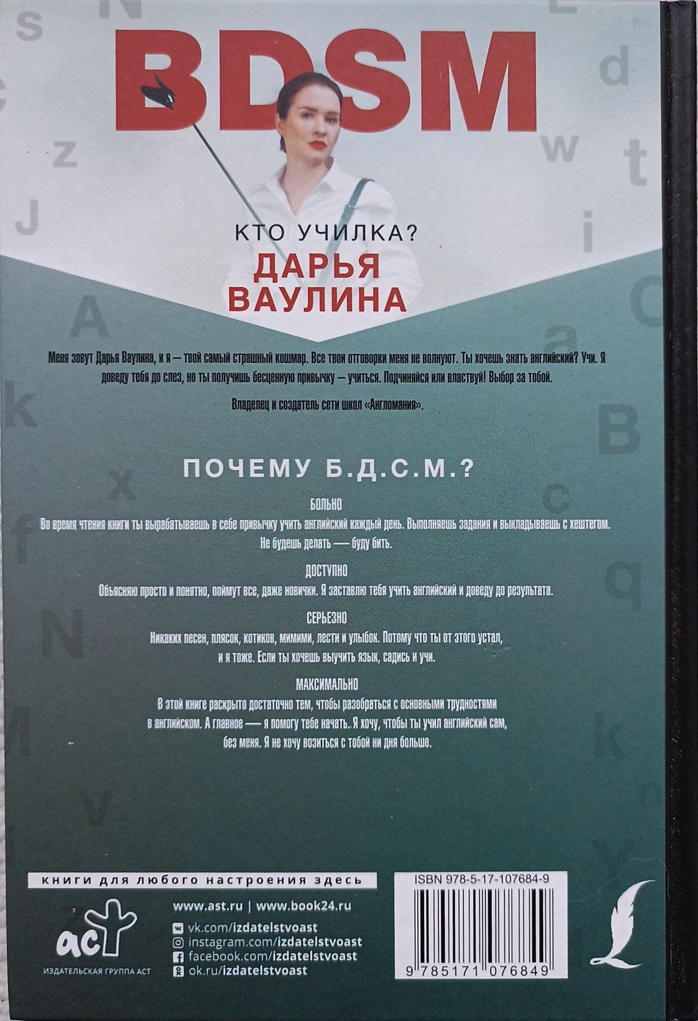 Меня зовут Дарья, я - создатель сети школ "Англомания" и автор самого жесткого языкового марафона #бдсманглийский. Я - твой самый страшный кошмар. Ты хочешь знать английский? Учи. Все твои отговорки меня не волнуют. Я доведу тебя до слез, но ты получишь бесценную привычку - учиться. Почему БДСМ? БОЛЬНО. Во время чтения книги ты вырабатываешь в себе привычку учить английский каждый день. Выполняешь задания и выкладываешь с хештегом. Не будешь делать - буду бить. ДОСТУПНО.