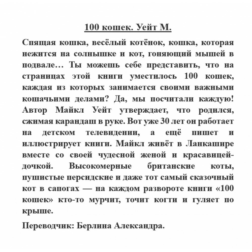 Редакция "Вилли Винки" представляет! Спящая кошка, весёлый котёнок, кошка, которая нежится на солнышке и кот, гоняющий мышей в подвале… Ты можешь себе представить, что на страницах этой книги уместилось 100 кошек, каждая из которых занимается своими важными кошачьими делами? Да, мы посчитали каждую! Автор Майкл Уейт утверждает, что родился, сжимая карандаш в руке. Вот уже 30 лет он работает на детском телевидении, а ещё пишет и иллюстрирует книги. Майкл живёт в Ланкашире вместе со своей чудесной женой и красавицей-дочкой. Высокомерные британские коты, пушистые персидские и даже тот самый сказочный кот в сапогах – на каждом развороте книги "100 кошек" кто-то мурчит, точит когти и гуляет по крыше.