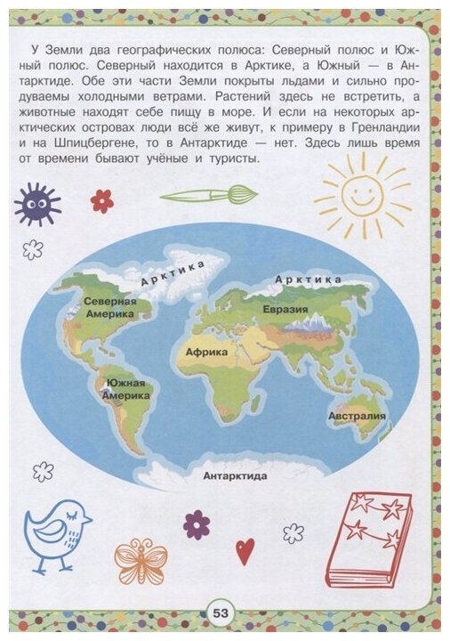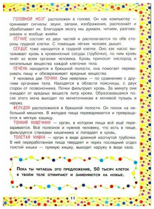 Почему люди внешне так отличаются друг от друга? Как устроен наш организм? До какого возраста растёт человек? Сколько мышц работает, когда мы хмуримся и когда улыбаемся? Что такое Вселенная? Что ожидает космических путешественников на Марсе? Куда уходит Солнце с наступлением ночи? Можно ли потрогать кольца Сатурна? Почему планету Земля называют уникальной? Где в жаркой Африке всегда лежит снег? Почему на экваторе царит вечное лето? Какая страна самая большая в мире? Почему динозавры больше не живут на нашей планете? Есть ли звёзды на дне океана? Для чего кенгуру сумка? Почему ленивец ленится? Отчего рыбы не тонут во сне? Какая птичка похожа на бабочку?