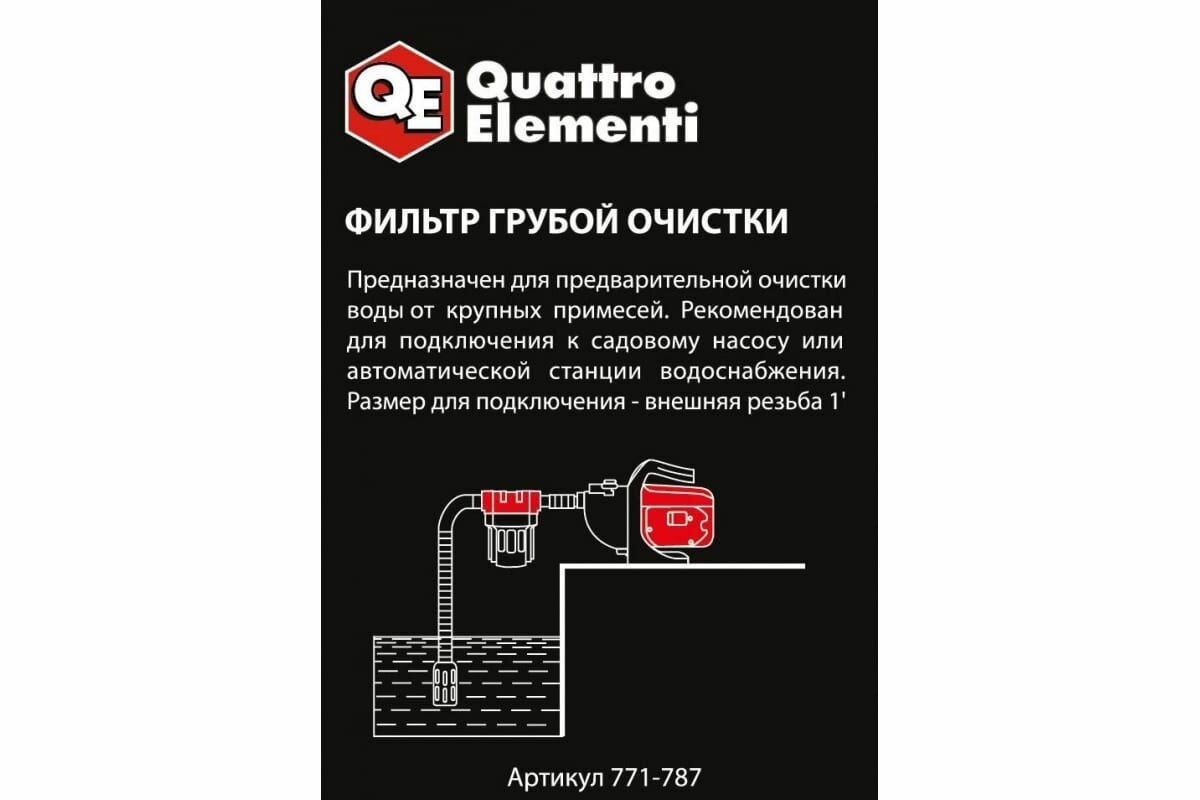 Фильтр предварительной очистки QUATTRO ELEMENTI 771-787 применяется для предварительной очистки от механических примесей и песка воды, поступающей в насос. Защищает механизмы насоса и обратный клапан от загрязнения, продлевая срок его эксплуатации. Фильтр легко прочистить или заменить. Объем фильтра - 1 л.Технические характеристики фильтра для воды QUATTRO ELEMENTI 771-787 Диаметр соединения, дюйм 1