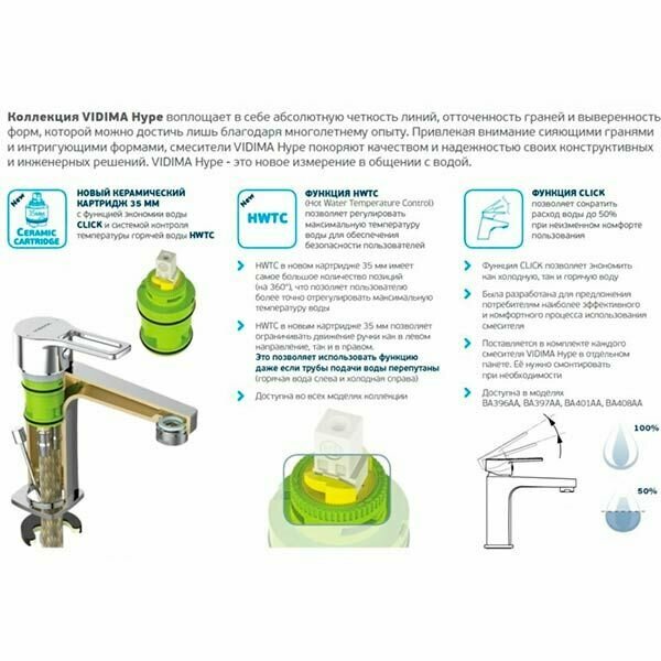 - Функция Click позволяет снизить расход воды до 50 процентов, не теряя при этом в комфорте. Ограничение устанавливается в картридже при необходимости.