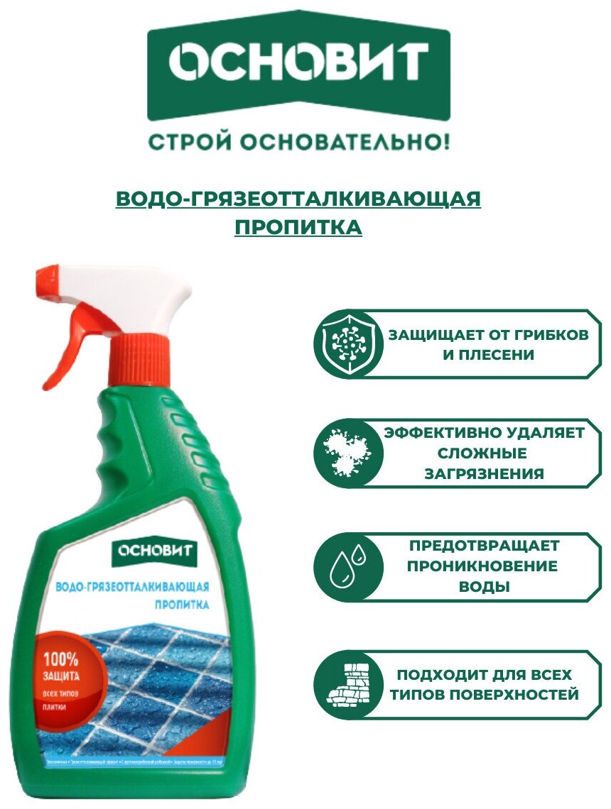 Водо-грязеотталкивающая пропитка Основит предназначена для защиты от загрязнений, атмосферных воздействий, образований высолов, поражений грибком кирпичных и бетонных оснований, цементных и цементно-известковых штукатурок, минеральных декоративных покрытий, межплиточных швов, облицовочного камня, пено- и газобетона. Для внутренних и наружных работ.