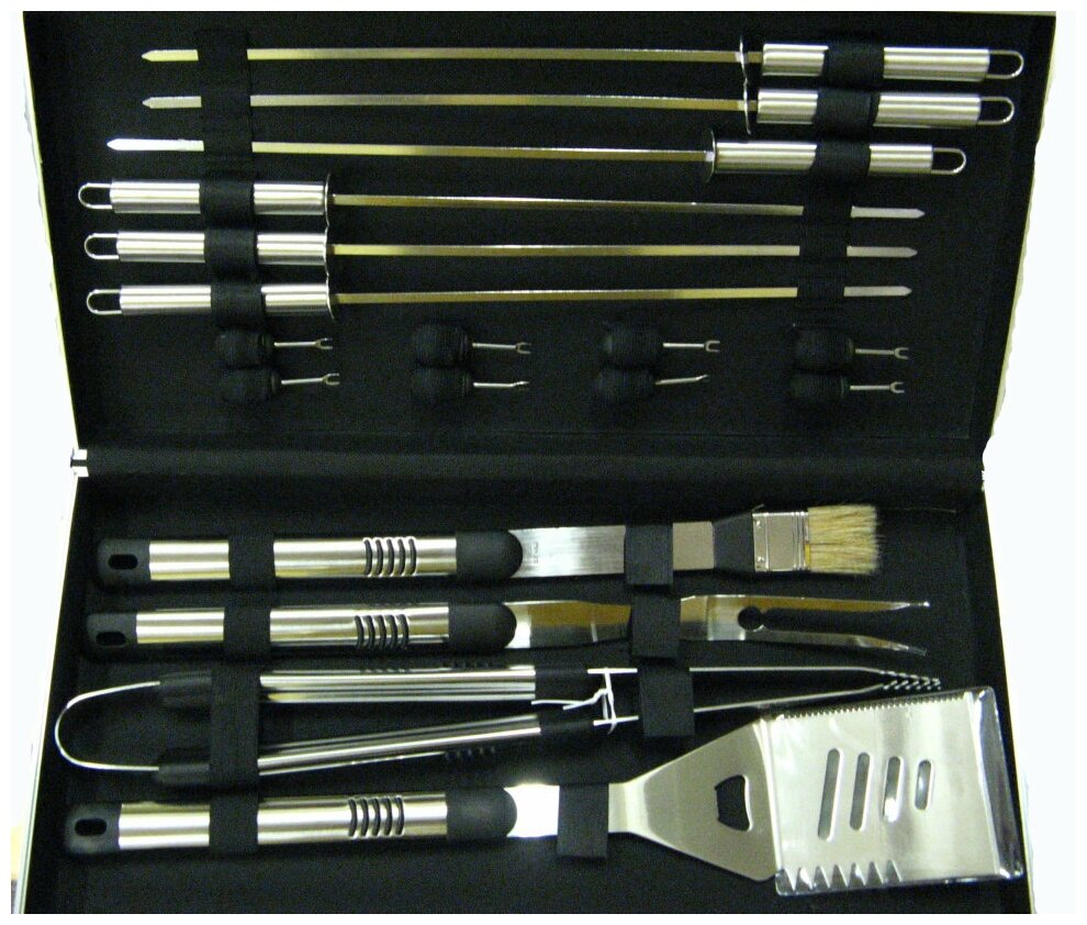 | Состав комплектации | лопатка для гриля (48х9 см), щипцы для гриля (47,5х6 см), вилка для гриля (46,5х4 см), щетка для гриля (45х4 см), шампуры (42х0,5 см - 6 шт.), вилка для кукурузы (6,5х2 см - 8 шт.), чемодан |