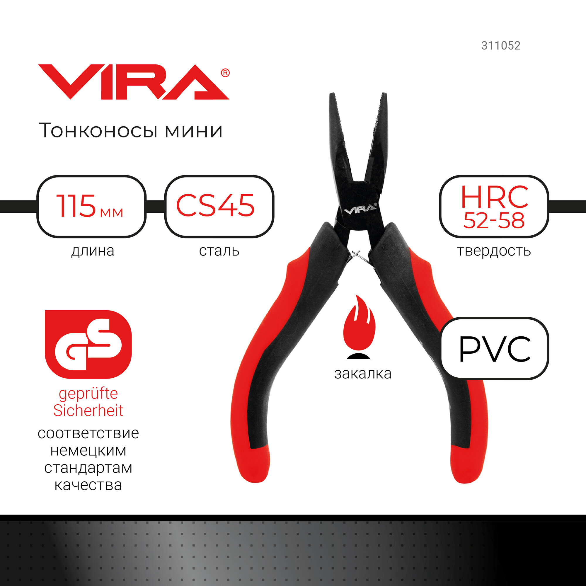Рабочая часть инструмента выполнена из высокоуглеродистой стали CS55. Твердость режущих граней 56-62 HRC. Весь инструмент компании VIRA приведен в соответствие с требованиями немецкого стандарта качества Geprüfte Sicherheit (GS). Эта маркировка на инструментах означает, что продукция надежна и удобна в использовании. Ко всей металлической поверхности изделия применено воронение для защиты от коррозии. Это важно, если инструмент будет храниться в условиях повышенной влажности воздуха – на приусадебном участке, в сыром гараже. Рукоятки выполнены из прочного пластика и резины TPR. Такое сочетание материалов дает прочность одновременно с мягкостью на ощупь. Расширенная часть ручек прикрывает пальцы от возможных повреждений во время работы и создает дополнительную опору.