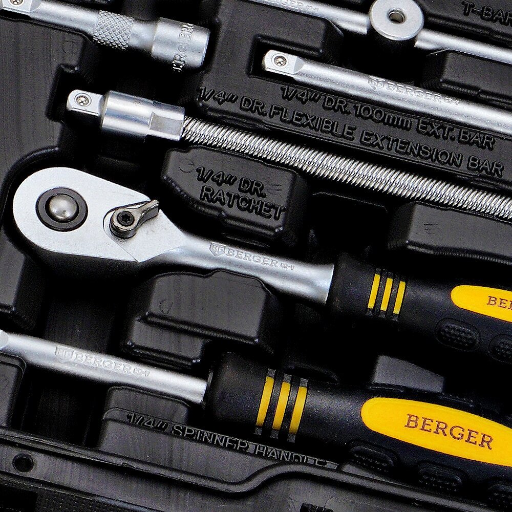 BERGER — профессиональный набор торцевых головок, ключей и бит (всего 45 предметов). Подойдет для монтажа, слесарных работ, мелкого ремонта автомобилей и другой техники. Насадки — из хромванадиевой стали. Благодаря профилю Super Lock грани крепежа не срываются при откручивании, и вы можете приложить большее усилие.