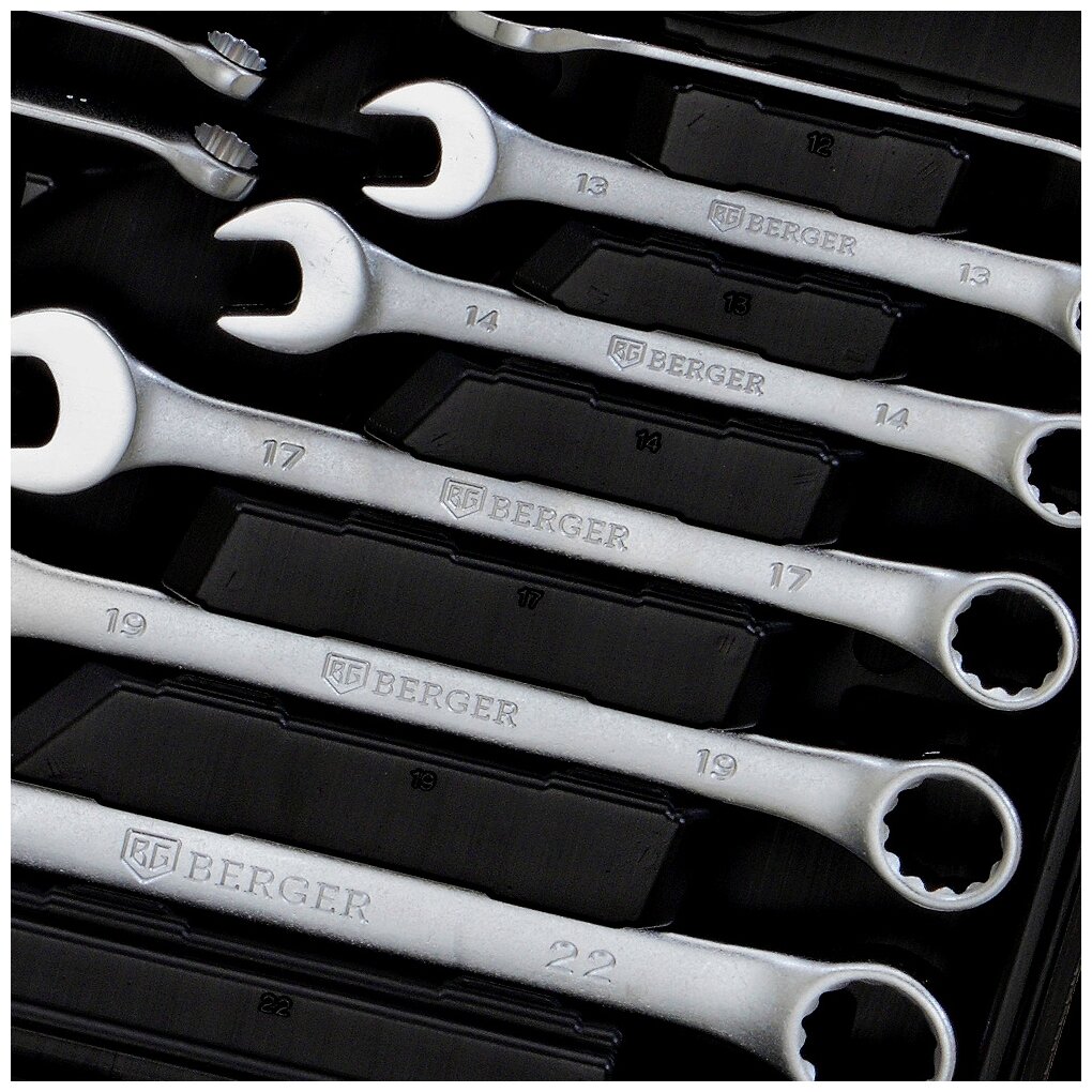 Набор комбинированных ключей BERGER предназначен для работы с различными видами шестигранного крепежа. Инструмент изготовлен из высокопрочной хромованадиевой стали, что гарантирует длительный срок его эксплуатации. Для защиты от корозии ключи имеют никель-хромовое покрытие.