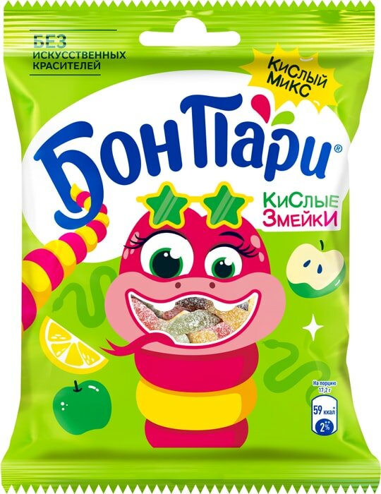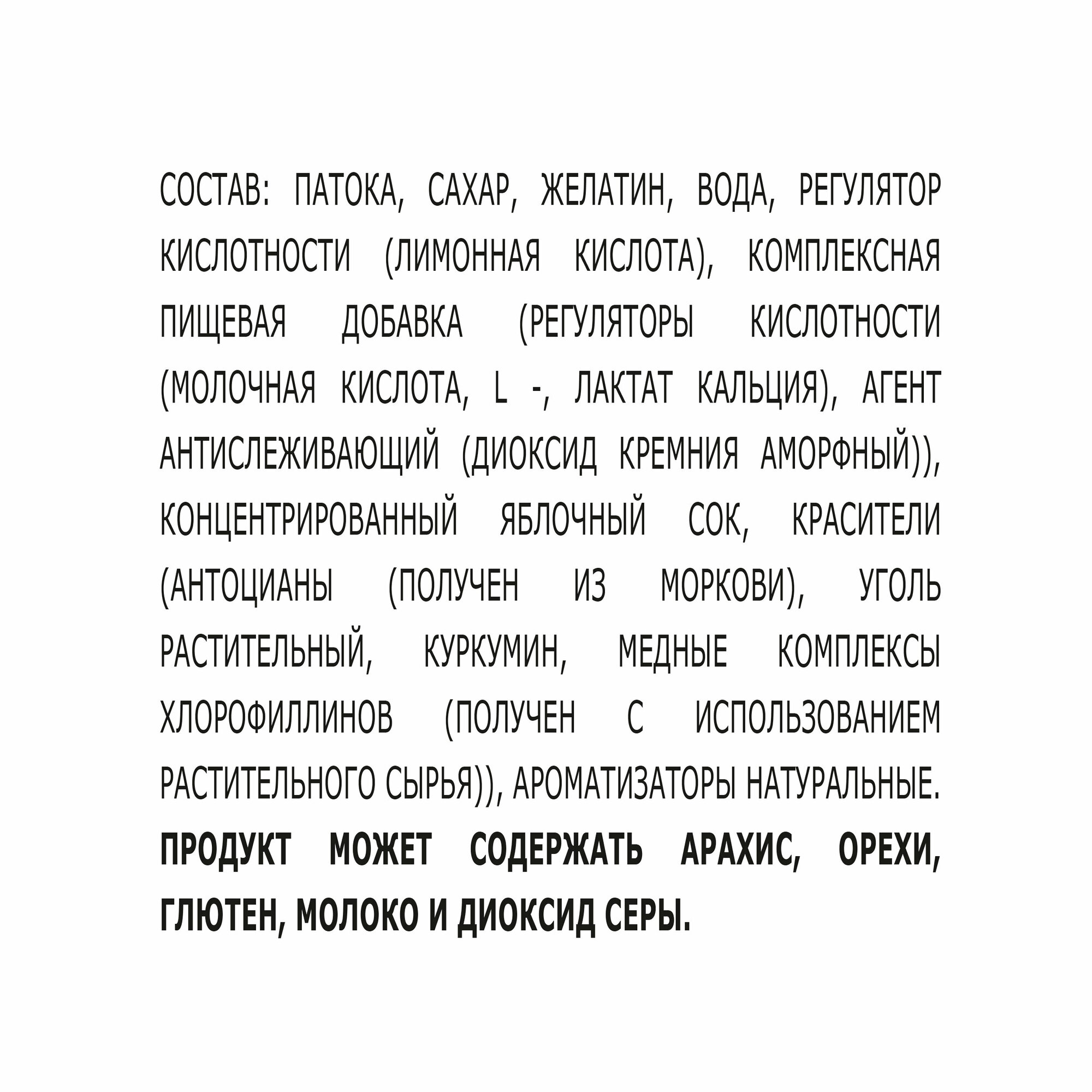 | Состав | Патока, сахар, желатин, вода, регулятор кислотности (лимонная кислота), комплексная пищевая добавка (регуляторы кислотности (молочная кислота, L-, лактат кальция), агент антислеживающий (диоксид кремния аморфный)), концентрированный яблочный сок, красители (антоцианы (получен из моркови), уголь растительный, куркумин, медные комплексы хлорофиллинов (получен с использованием растительного сырья)), ароматизаторы натуральные. Продукт может содержать арахис, орехи, глютен, молоко и диоксид серы. |