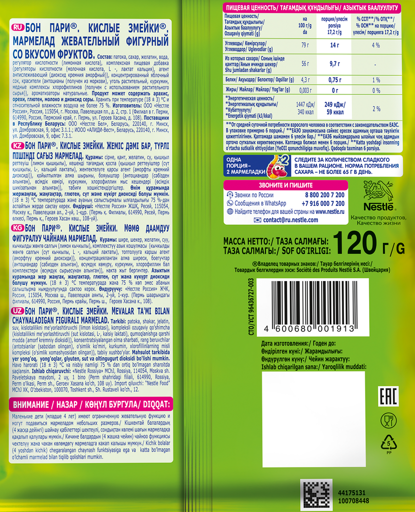 Описание товара:Кислый жевательный мармелад со вкусом фруктов в сахарной обсыпке - яблоко/малина и лимон/черная смородина. Форма - длинная забавная змейка. Без искусственных красителей. Сочный микс.Состав товара:Патока, сахар, желатин, вода, регулятор кислотности (лимонная кислота), комплексная пищевая добавка (регулятор кислотности (молочная кислота, лактат кальция), агент антислеживающий (диоксид кремния аморфный)), концентрированный яблочный сок, натуральные красители (антоцианы (получен из моркови) куркумин, медные комплексы хлорофиллинов (получен из шелковицы)), натуральные ароматизаторы (черная смородина, яблоко, с маслом лимона, малина), комплексная пищевая добавка (глюкозный сироп, носитель (глицерин), натуральный краситель (уголь растительный)). Продукт может содержать орехи, глютен, молоко и диоксид серы. 96436727-003.Меры предосторожности:Внимание: маленькие дети (младше 4 лет) имеют ограниченную жевательную функцию и могут подавиться мармеладом небольших размеров. Продукт может содержать орехи, глютен, молоко и диоксид серы.