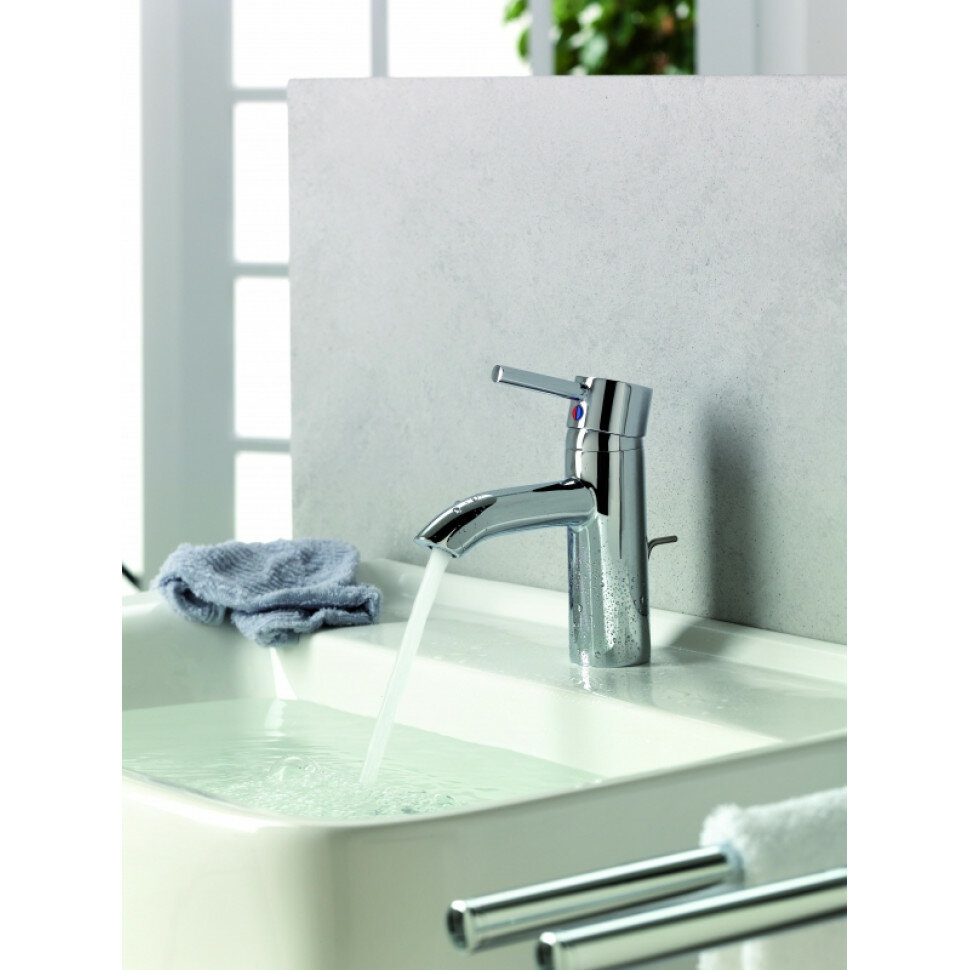 Однорычажный смеситель для раковины, литой рычаг, монтаж на одно отверстие. Керамический картридж с ограничителем горячей воды, аэратор Cache M 16,5 x 1, гибкая подводка G 3/8, система быстрого монтажа, донный клапан G 1 1/4.