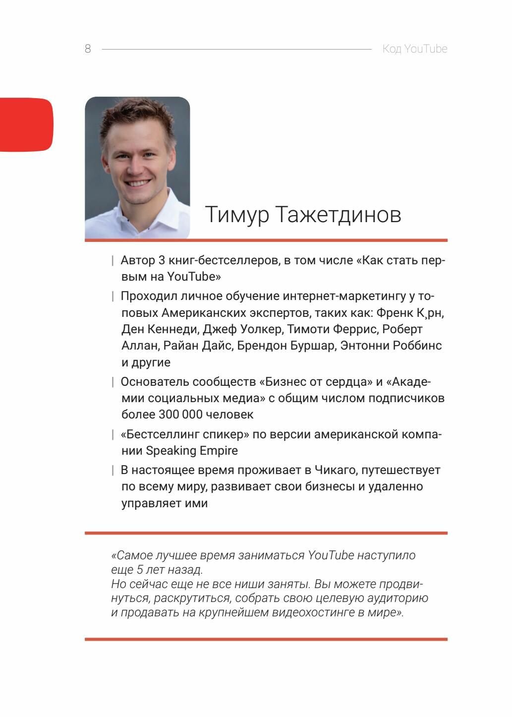 "Код YouTube" - квинтэссенция самого полного и практического курса по YouTube, созданного известными экспертами Павлом Багрянцевым и Тимуром Тажетдиновым, у которых за плечами многолетний опыт успешного продвижения как собственных, так и сторонних каналов. Почему их видео набирают миллионные просмотры?