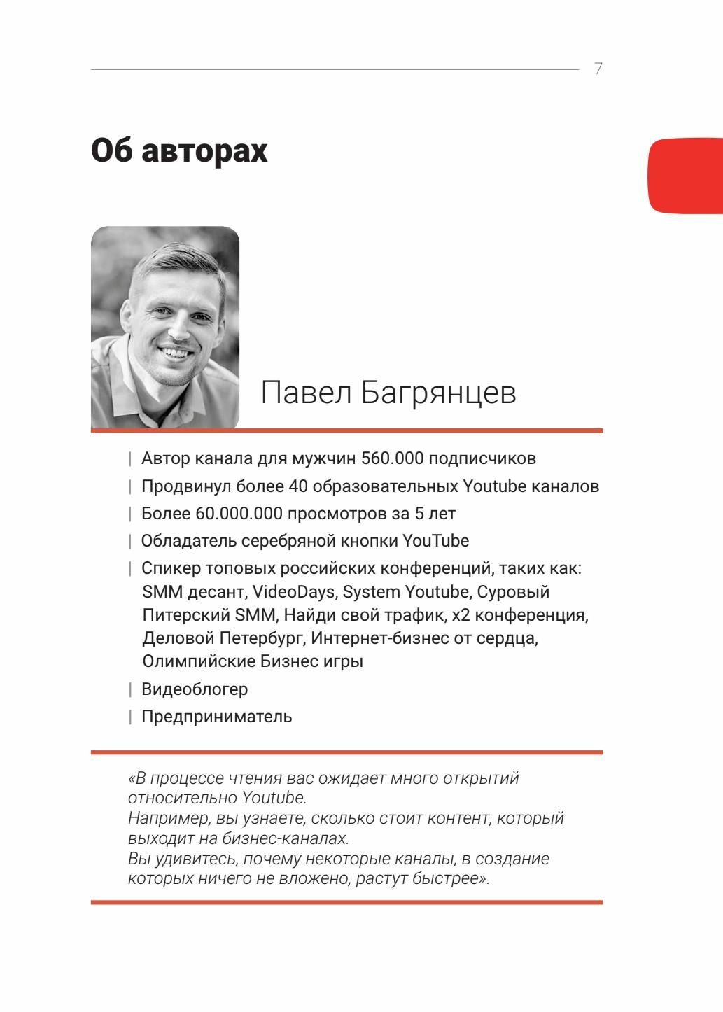 Багрянцев вызывает уважение даже и сам по себе,как человек,который сделал себя с нуля.После прочтения его первой книги я поняла,что во многих случаях мы мыслим одинаково.Было такое ощущение,что мне это рассказывает мой старший брат.Настолько легко читалось.Естественно,что выход второй его книги я ждала с нетерпением.Могу заметить,что книжка очень толковая,с действительно работающими рекомендациями,от реально продвинутого блоггера You Tube.