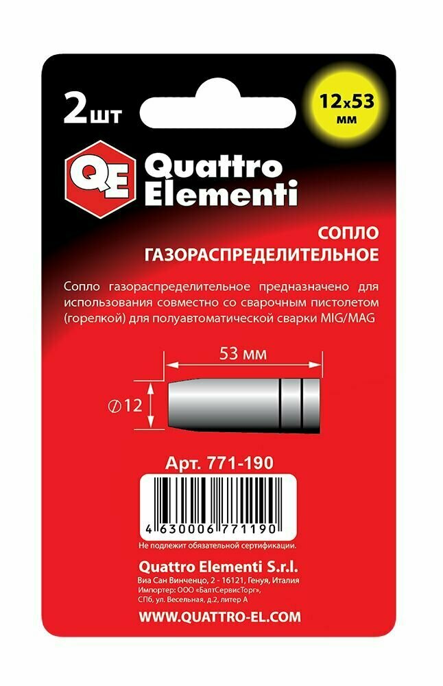 На сегодняшний день товар «Газораспределительное сопло для горелок полуавтоматов QUATTRO ELEMENTI 12x53мм» можно купить с кешбеком в 1 магазине: Яндекс.Маркет