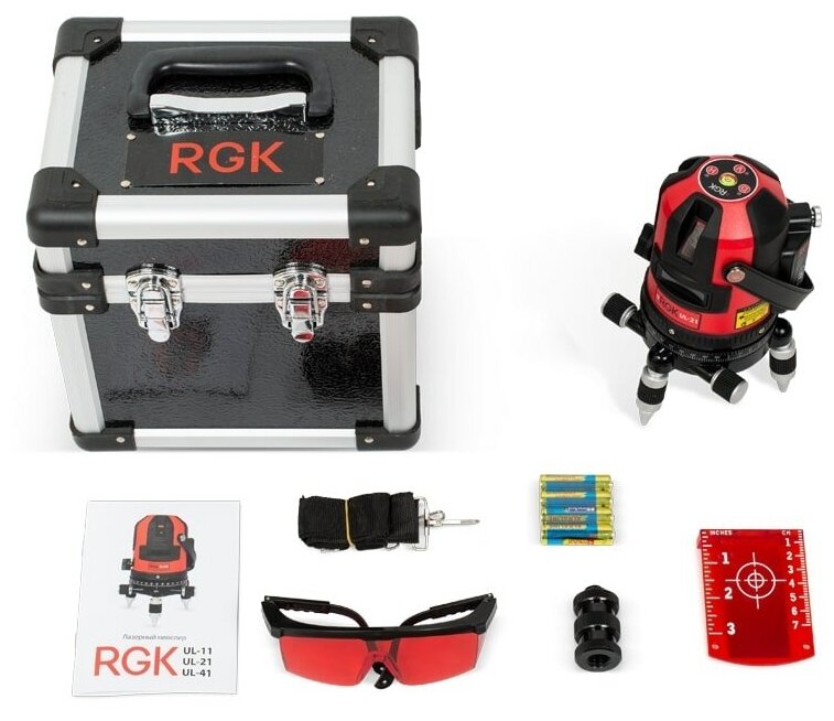 | Комплектация | Лазерный нивелир RGK UL-21, мишень, лазерные очки, элементы питания, кейс. |