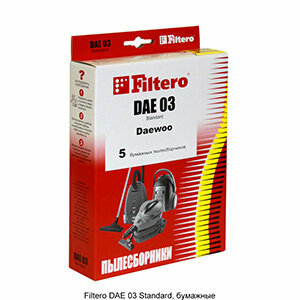 | Прочие особенности и свойства | Мешки-пылесборники Filtero DAE 03 Standard 5 штук. Бумажные пылесборники Filtero произведены из специальной двухслойной фильтровальной бумаги на оборудовании соответствующему европейскому стандарту качества ISO 9002,Пылесборники подходят для следующих моделей пылесосов:,,DAEWOO,RC 200 H,RC 300, RC 305, ,RC 320 B, F, RC 330 FR,RC 350, RC 360, ,RC 370 B, RC 371,RC 400 B, RC 410, ,RC 470, RC 480,RC 700,RC 3000 B, S, G,RC 3002,RC 3004,RC 3005,RC 3006 B,RC 3011,RC 3204,RC 3500 B,RC 3700 BA, GA, RA, SA,RC 3704,RC 3705,RC 3750 G, R, Y,RC 3800 R Fortis,RC 4000,RC 4005,RC 4006 B Votex,RC 4008 B, S,RC 4500 R,RC 5018 BA,RC 6001 T,RC 6002 NB, NE,RC 7005 B, S,RC 8001 T,RC 8002 B, S,RC 9000. |