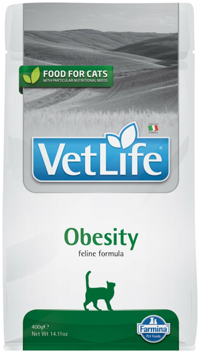 Farmina Vet Life Obesity – диетический сухой корм для взрослых кошек, разработанный для снижения излишнего веса.Механизм действия:Farmina Vet Life Obesity ограничивает количество потребляемых калорий и способствует снижению веса. Повышенное содержание пищевых волокон вызывает ощущение сытости и снижает аппетит. Низкий уровень и высокое качество источников крахмала и сахара позволяет использовать диету в терапии пациентов страдающих сахарным диабетом. Рецептура диеты содержит карнитин, стимулирующий окисление жиров, и высококачественные белки, что позволяет избежать снижения мышечной массы в процессе похудения.Рекомендации по кормлению:Использовать по назначению ветеринарного врача. Необходимо использовать Farmina Vet Life Obesity до достижения вашей кошкой идеального веса. Необходимое суточное количество корма указано в таблице. Всегда оставляйте вашей кошке чистую миску свежей воды в течение дня. Ограничение жиров: Ограничение жиров при высоком содержании незаменимых жирных кислот помогает сократить потребление калорий.L-карнитин. L-карнитин стимулирует окисление жиров и способствует наращиванию мышечной массы.Поддержание чувства сытости. Обогащение рациона растворимой фракцией клетчатки вызывает ощущение сытости.Комплекс антиоксидантов. Природные антиоксиданты защищают клетки от воздействия свободных радикалов.Высококачественные белки. Высокое качество белков предотвращает потерю мышечной массы.Все продукты Farmina разработаны специалистами и протестированы на собаках и кошках в домашних условиях содержания.