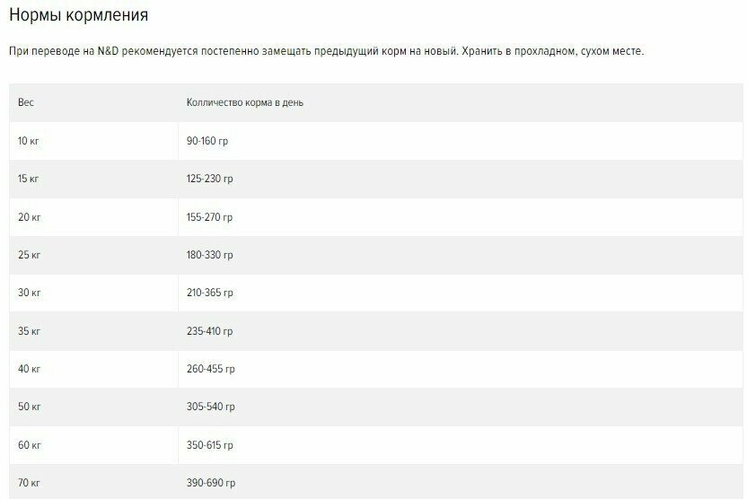 Нормы кормления указаны в таблице на упаковке. При переводе на N&D рекомендуется постепенно замещать предыдущий корм на новый. Хранить в прохладном, сухом месте, в закрытой упаковке. Произведено за 18 месяцев до окончания срока годности, указанного на упаковке. Производится из ингредиентов преимущественно из Италии, Дании и Франции. Масса нетто, срок годности, номер партии и регистрационный номер завода указаны на упаковке.