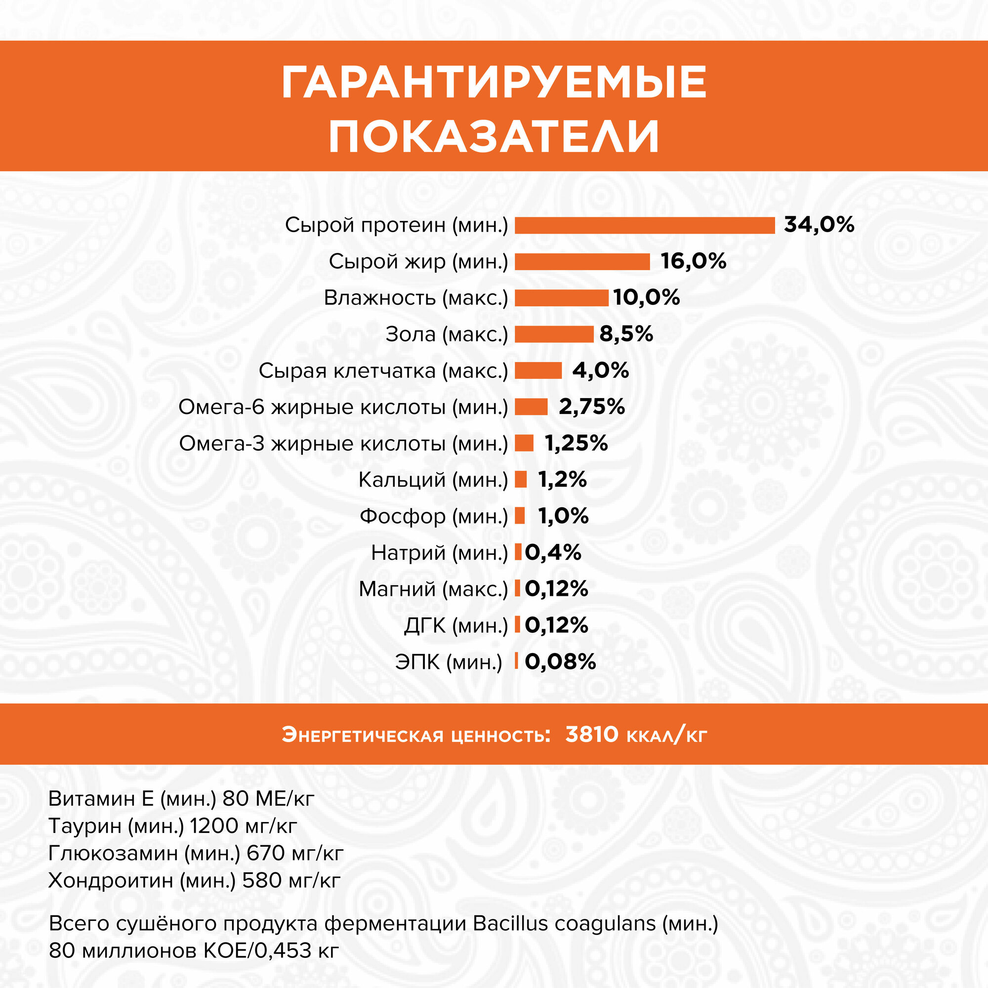 Беззерновой корм класса холистик. Сочетание ненасыщенных омега-3 и омега-6 жирных кислот, витамина E и цинка в легко доступной хелатной форме оказывают максимальный эффект на здоровье кожи, способствуют устранению перхоти, придают блеск и эластичность шерсти. Свежее филе курицы и лосося легко усваивается, обогащает рацион незаменимыми аминокислотами и гарантирует великолепный вкус. Уникальное сочетание энзимов и пробиотиков улучшает усвоение питательных веществ и нормализует пищеварение, а добавка юкки Шидигера уменьшает неприятный запах фекалий. Сочетание строгого баланса минеральных веществ и клюквы, подкисляющей мочу и обладающей противовоспалительным и бактерицидным эффектом, гарантирует эффективную профилактику мочекаменной болезни. Рацион обогащён глюкозамином и хондроитином для поддержания здоровья суставов. Благодаря оптимальному сочетанию омега-3 жирных кислот и биологически активных антиоксидантов рацион оказывает эффективную поддержку иммунной системе и помогает организму бороться с воспалениями, что особенно важно в неблагоприятной экологической обстановке.