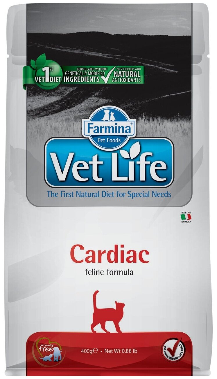 Поддержание работы сердца при хронической сердечной недостаточности.Farmina Vet Life Cardiac – диетический сухой корм для кошек для поддержания работы сердца при хронической сердечной недостаточности. Диета содержит низкий уровень натрия и оптимальное соотношение калия/натрия.Механизм действия:Специально подобранное соотношение хлора, калия и натрия компенсирует дисбаланс электролитов при кардиомиопатии и/или медикаментозном лечении. Введение таурина помогает регулировать функции миокарда и ионный обмен на клеточном уровне. Добавка L-Карнитина оказывает положительное влияние на обмен липидов и использование энергии. На начальной фазе заболевания можно снижать суточное количество корма для снижения массы тела, на поздних стадиях белки высокой биологической ценности, входящие в состав диеты и высокая усваиваемость снижают риск развития сердечной кахексии.Рекомендации по применению:Перед использованием и для продления использования необходимо проконсультироваться с ветеринарным врачом. Рекомендованное суточное количество корма указано в таблице на упаковке. Продолжительность курса лечения 6 месяцев. Суточное количество корма может изменяться в зависимости от породы, физической нагрузки, течения и тяжести заболевания. Количества корма, указанные в таблице, имеют относительный характер и требуют корректировки для поддержания оптимальной массы тела. Суточное количество корма может быть разделено на два и более кормлений. Всегда оставляйте вашей кошке миску с водой в течение дня. Таурин. Таурин регулирует ионный обмен.Баланс электролитов. Баланс электролитов регулирует сократительную способность миокарда.L-карнитин. L-Карнитин обеспечивает оптимальное использование энергии, сохраняет мышечную массу.Омега-3. Омега-3 оказывает противовоспалительное действие.Белки высокой биологической ценности. Белки высокой биологической ценности обеспечивают необходимое содержание незаменимых аминокислот.Все продукты Farmina разработаны специалистами и протестированы на собаках и кошках в домашних условиях содержания.