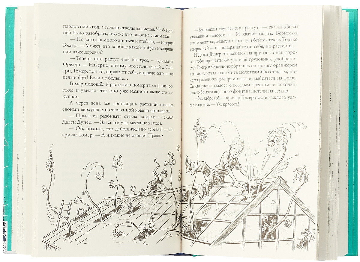 Во второй книге о приключениях Гомера Прайса читателей ждут: жуткие аллергенные сорняки размером с дерево; подозрительное средство "иещеболее"; сводящая с ума привязчивая песенка, разрушившая целую библиотеку; куча безумнейших историй дедушки Геракла; немного вредная Джинни Ли; а также толпа уже знакомых нам жителей обаятельного городка Сентерберга, который давно бы исчез с лица земли, если бы не находчивость Гомера Прайса и его друзей.