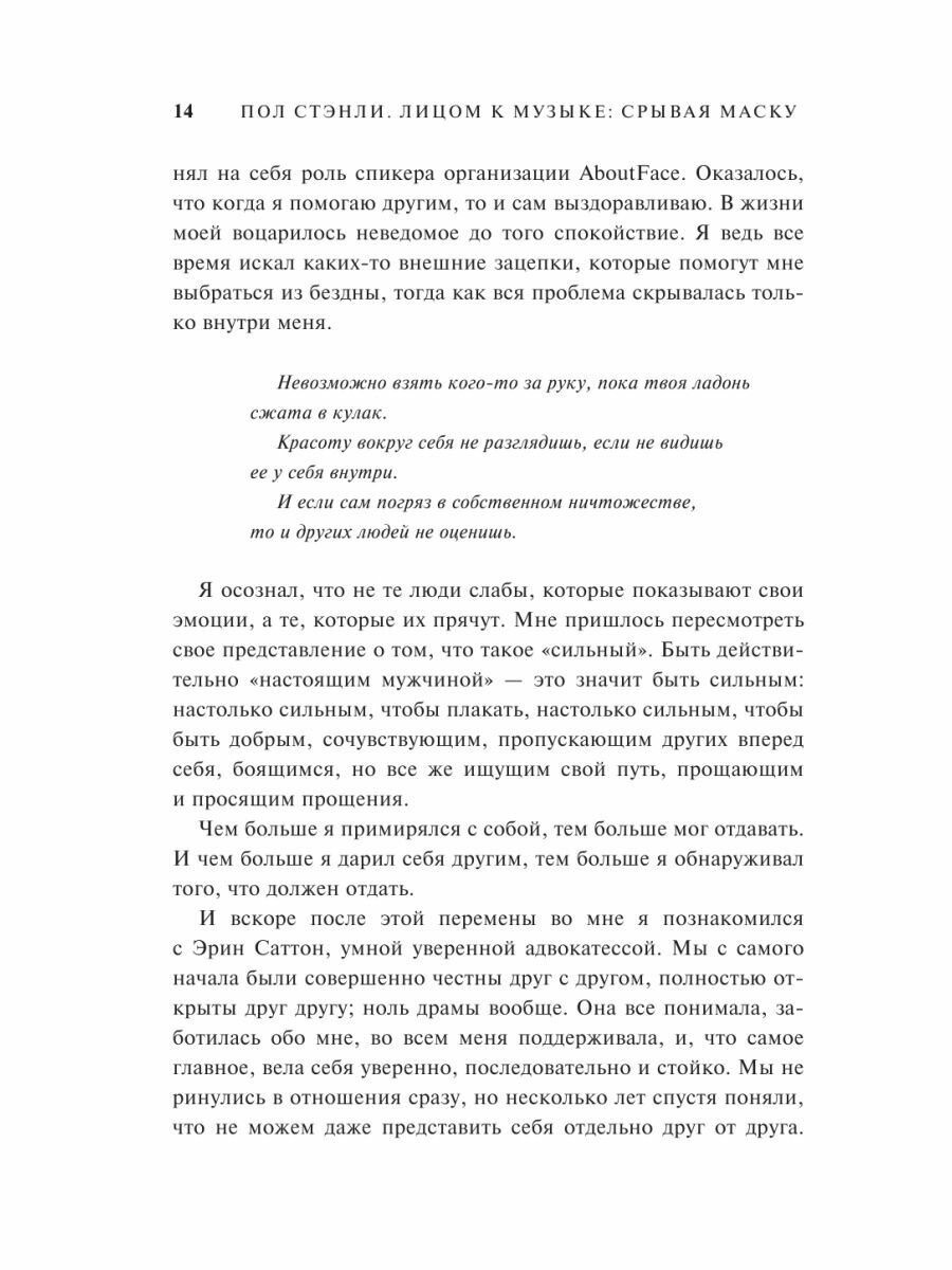 Книга будет интересна даже тем, кто не является фанатами группы Кисс. Она не про группу, она про историю человека, который прошел свой путь. Путь не к мечте, но к цели. Написана очень простым языком, написана живым человеком, а не идолом. Откровенная, трогательная, настоящая. От живого, простого, чувствующего человека для таких же, как он, живых, чувствующих, идуших к себе и своей цели. Точно буду перечитывать.
