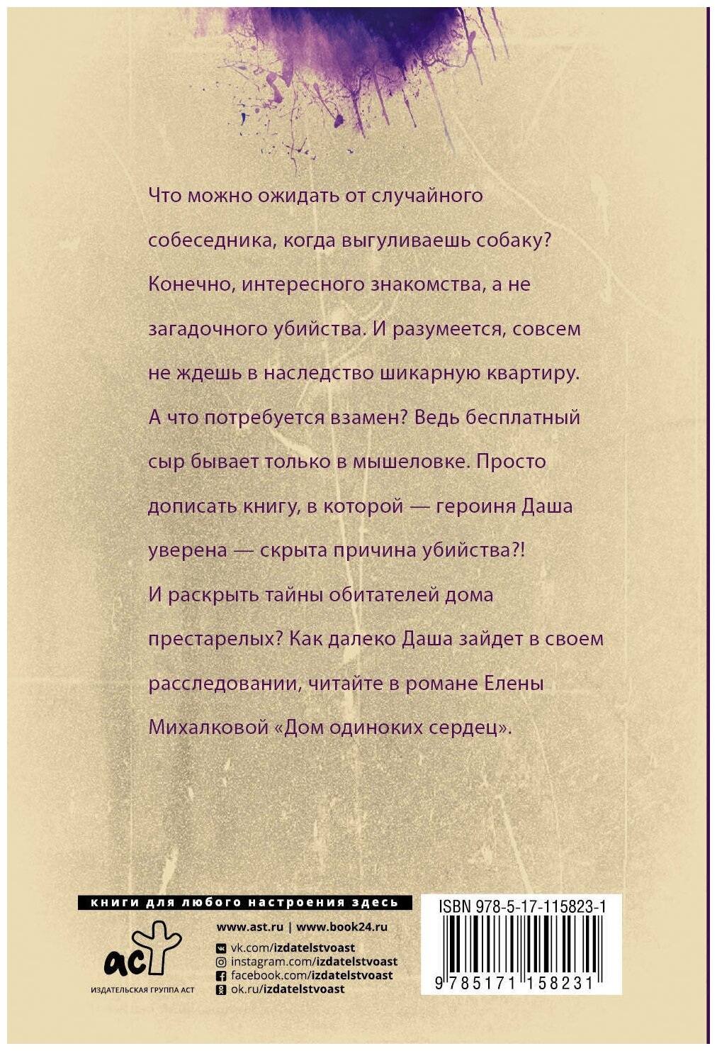 Что можно ожидать от случайного собеседника, когда выгуливаешь собаку? Конечно, интересного знакомства, а не загадочного убийства. И разумеется, совсем не ждешь в наследство шикарную квартиру. А что потребуется взамен? Ведь бесплатный сыр бывает только в мышеловке. Просто дописать книгу, в которой - героиня Даша уверена - скрыта причина убийства?! И раскрыть тайны обитателей дома престарелых? Как далеко Даша зайдет в своем расследовании, читайте в романе Елены Михалковой "Дом одиноких сердец"