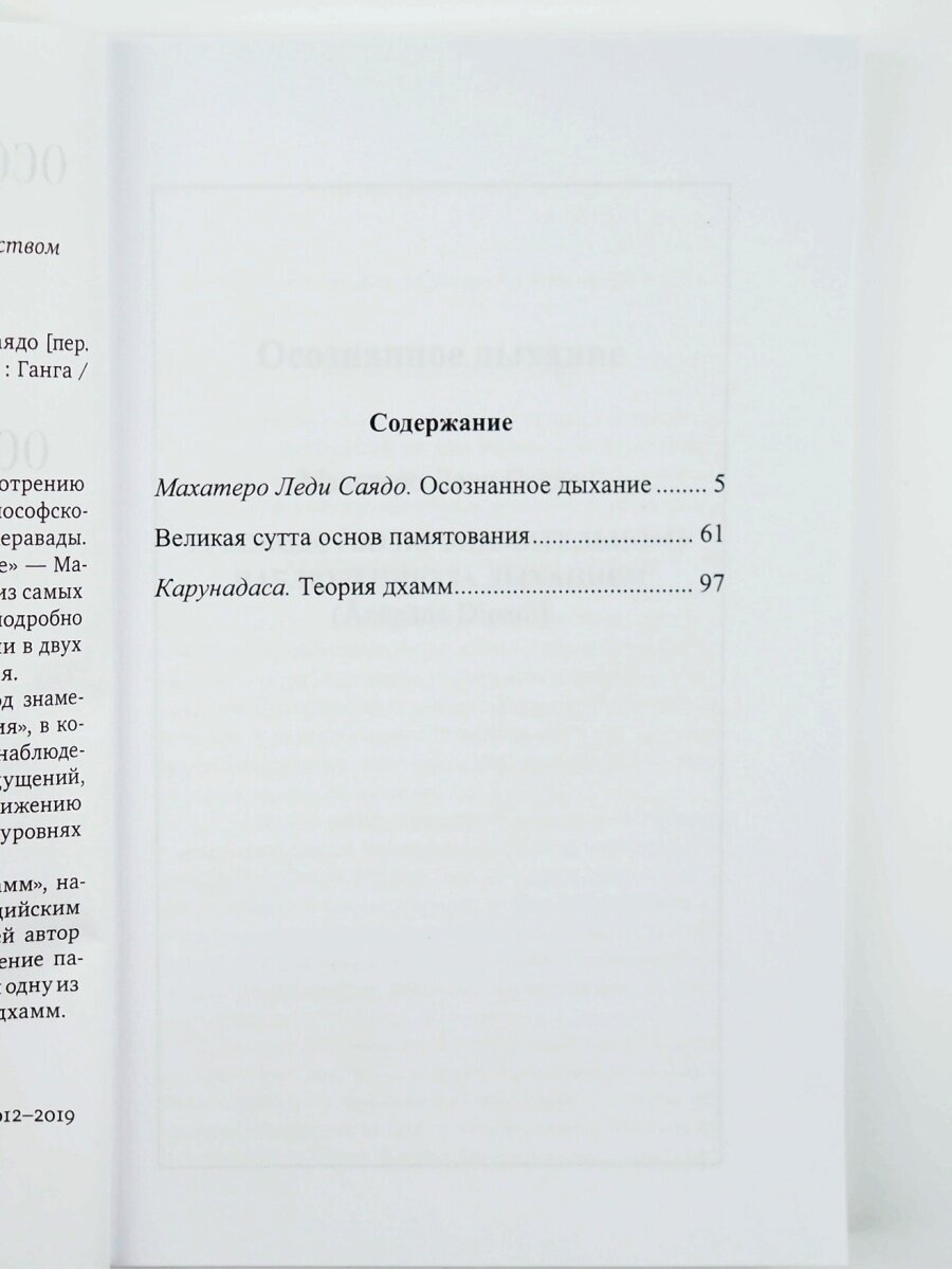 В первой работе - "Осознанное дыхание" - Махатеро Леди Саядо, считающийся одним из самых выдающихся буддистов начала ХХ века, подробно излагает практику медитации на дыхании в двух ее аспектах - безмятежности и прозрения.