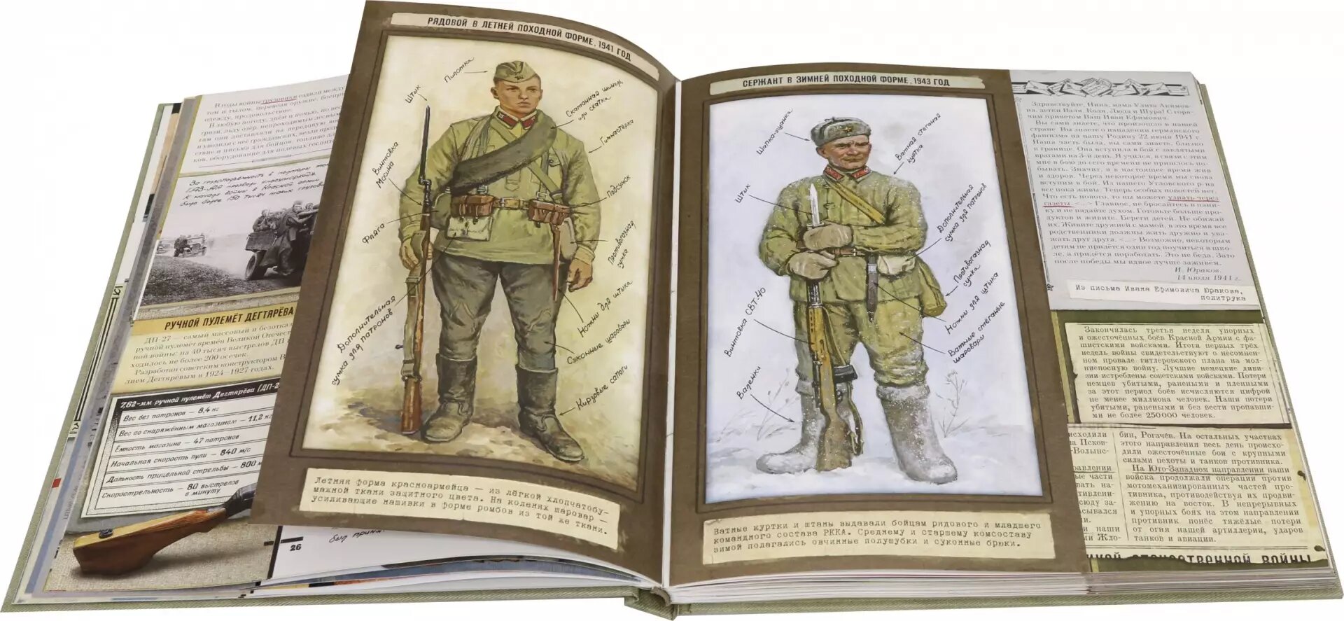 На полях книги, в клапанах и на специальных исторических разворотах размещён подробный историко-бытовой комментарий о ходе войны, устройстве советской армии, военной форме, оружии, орденах и повседневной жизни на фронте, в тылу, в эвакуации, в блокадном Ленинграде. Подлинные предметы и документы тех лет - письма с передовой, газетные очерки, военные плакаты, наградные листы и фотоснимки из семейных архивов - помогут увидеть и понять, какими были эти годы для всех, кого коснулась война.