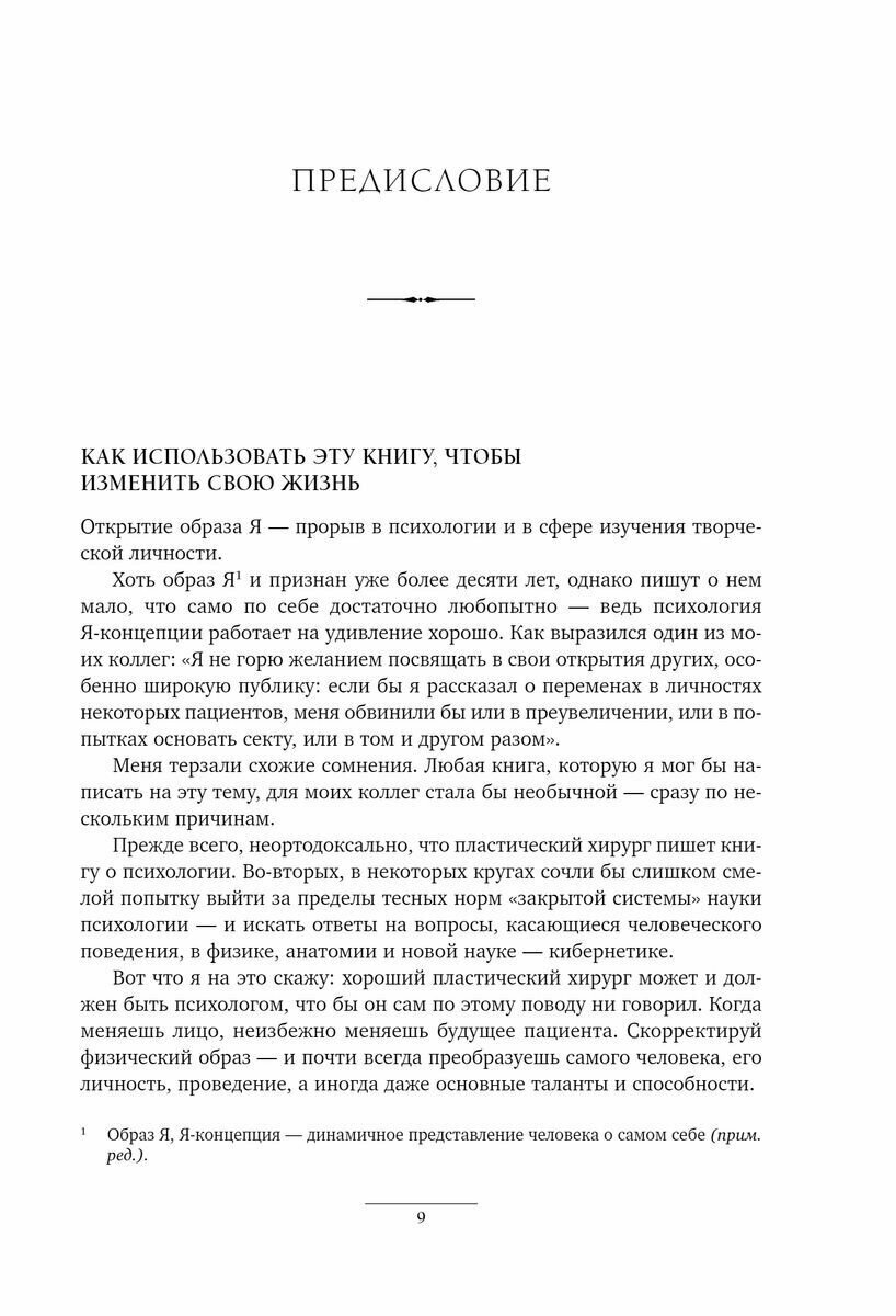 Книга по саморазвитию, написанная пластическим хирургом. Читала ее пару лет назад в каком-то старом издании с тогда еще ужасной обложкой их 90-х. Помню, поразилась глубине вроде бы очевидных идей. Долго потом мысленно возвращалась к тексту Мольца. Странно, что его так долго не переиздавали в России. Книга очень сильная. Очень сильная, мудрая, простая и от этого еще более полезная. Это не однодневка, как большинство других книг. Это своего рода Наполеон Хилл от психологии. Или Джо Диспенза. Очень полезно прочитать в подростковом возрасте, когда образ я только формируется. Купила дочери. Надеюсь, ей эта книга поможет, как когда-то помогла мне и тысячам других людей.