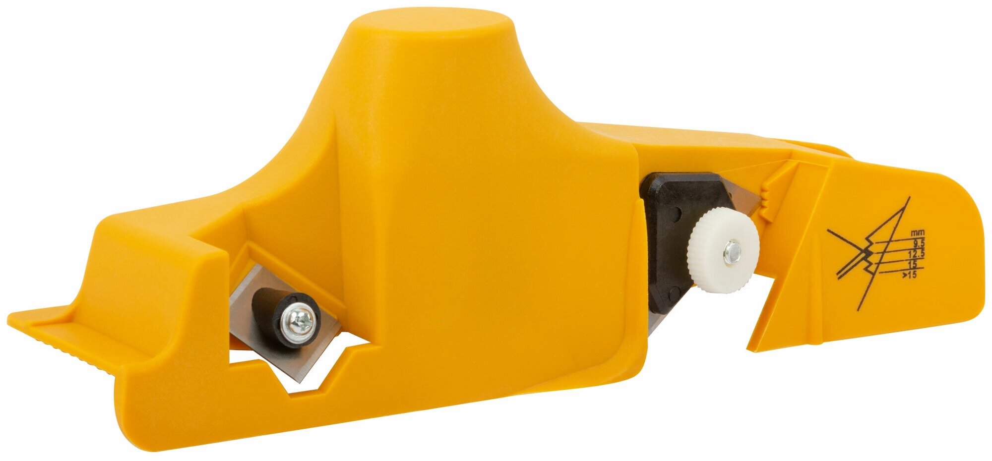 Пластикавый корпус. Для обрезания краёв гипсокартонной плиты под углом 22.5° и 45°. Возможность регулировки в зависимости от толщины плиты: 9.5 мм, 12.5 мм и более 15 мм.
