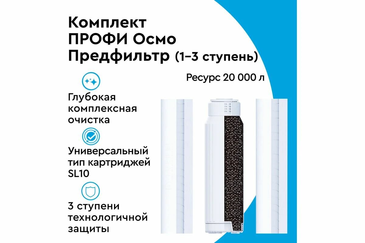 Комплект картриджей для обратноосмотического фильтра семейства . Устанавливается в качестве 1-3 ступеней, подготавливает воду к обратноосмотической мембране. Совместим с фильтрами стандарта SL 10.