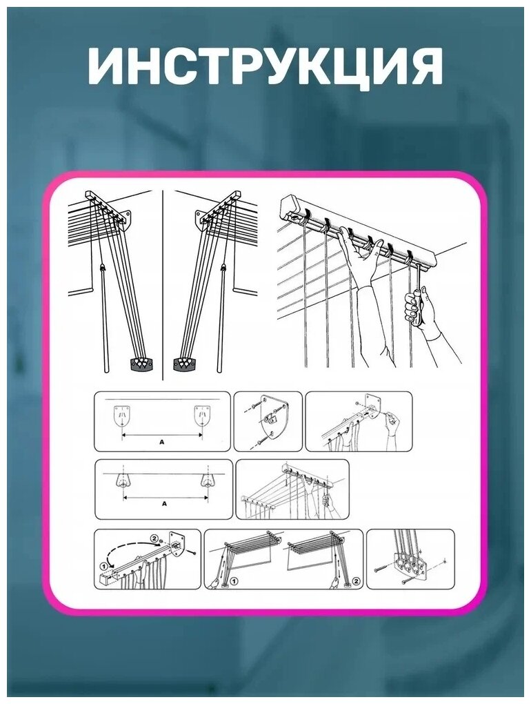 | Дополнительная информация | позволяет опускать штанги одновременно или по очереди, развешивать белье на удобной высоте, а затем поднимать их под потолок, положение сушки фиксируется специальным ограничительным механизмом, может монтироваться на балконе, лоджии, в ванной комнате |