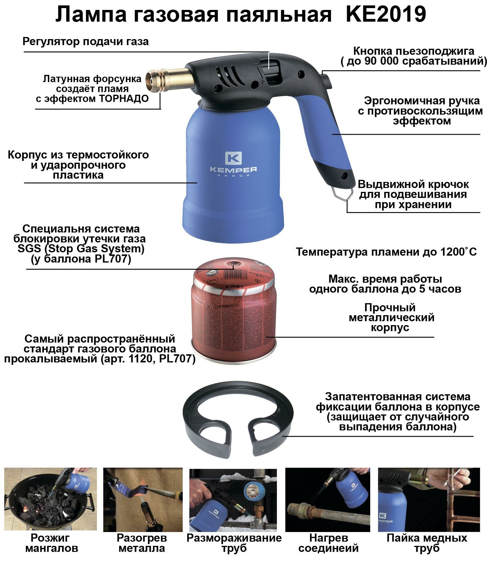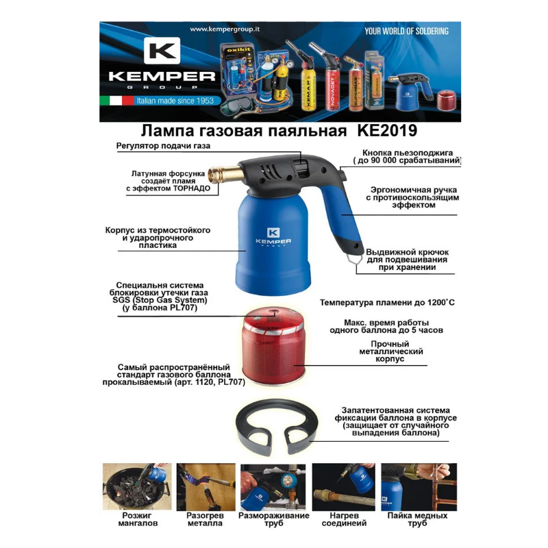 Предназначена для различных монтажных и строительных работ, например: для пайки медных, латунных, бронзовых труб; отогрев замерзших деталей, замков, водопроводных труб, фитингов; нагрев лакокрасочных и напольных покрытий, для их удаления; обжиг древесины; розжиг костра, угля, печей, камина и мн.др. Оснащена системой пьезоподжига, регулировкой пламени. Комплектация: поставляется без баллона. Производитель: Италия. Вес брутто: 0.39 кг. Технические характеристики: Максимальная температура до 1900 °С. Максимальный расход газа 140 гр./час Для работы с прокалываемыми баллонами KEMPER Арт. 1120, PL707 Работает от одного баллона до 3,5 часов.