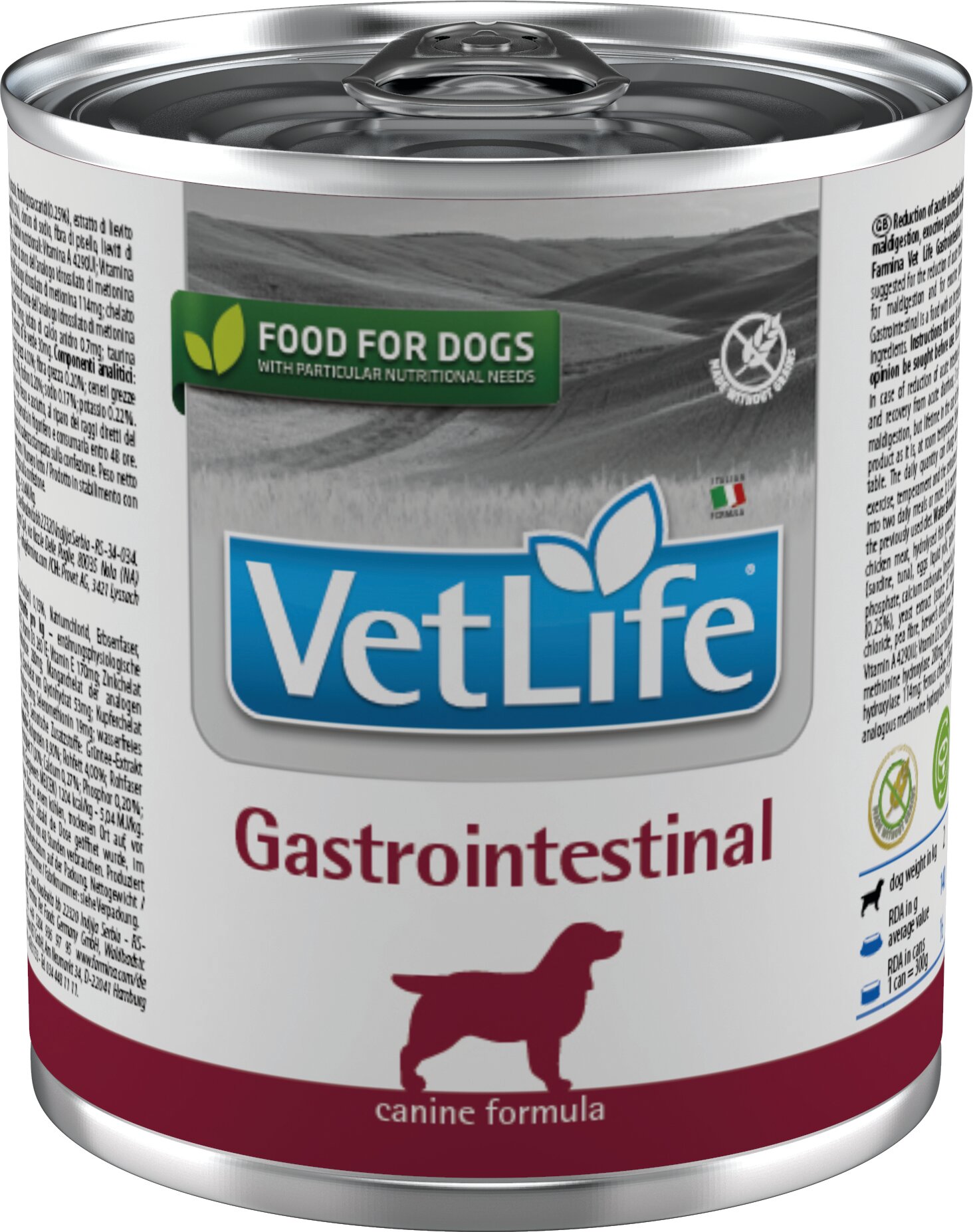 Воспалительные заболевания желудочно-кишечного тракта (ЖКТ), нарушения переваривания и всасывания.Farmina Vet Life Gastrointestinal — полнорационный диетический влажный корм для собак, рекомендуемый для лечения синдрома нарушения всасывания и переваривания пищи в ЖКТ, при экзокринной недостаточности поджелудочной железы. Farmina Vet Life Gastrointestinal также рекомендован для кормления собак в период реабилитации после хирургических операций на органах пищеварения.Механизм действия : Farmina Vet Life Gastrointestinal — высоко усвояемый рацион, способствует восстановлению нормальной микрофлоры и защищает слизистую оболочку кишечника с помощью растворимой фракции клетчатки. Диета также рекомендована для собак с пониженной ферментативной активностью поджелудочной железы и при остром панкреатите на начальной стадии или когда животное начинает потреблять пищу. В период реабилитации после хирургических вмешательств на ЖКТ рекомендовано увеличить количество кормлений до 6 раз в день. Рекомендации по применению: Использовать по назначению ветеринарного врача. Рекомендуемая схема кормления: 1-2 недели в случае острого нарушения всасывания в кишечнике, 3-12 недель в случае нарушения переваривания пищи/ на протяжении всей жизни в случае хронической недостаточности поджелудочной железы. Суточное количество корма указано в таблице и может меняться в зависимости от породы, условий содержания, физических нагрузок и стадии заболевания. Всегда оставляйте собаке миску свежей питьевой воды в течение дня.Содержит ФОС и МОС. Пребиотики (фруктоолигосахариды и моноолигосахариды) обеспечивают баланс микрофлоры кишечника и способствуют усвоению питательных веществ. Растворимая клетчатка. Высокий уровень растворимой фракции клетчатки обеспечивает восстановление нормальной перистальтики кишечника. Омега-3. Незаменимые жирные кислоты оказывают противовоспалительное действие на слизистую оболочку кишечника. Витамины и электролиты. Витамины и электролиты восстанавливают клеточный гомеостаз после длительной диареи.