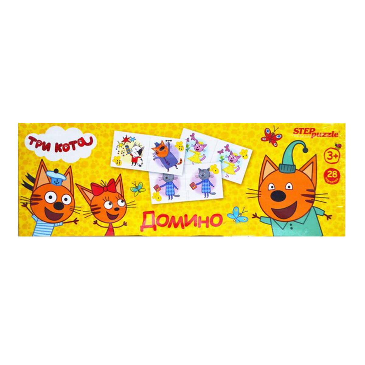 Домино «Три кота» – развивающая настольная игра с героями одноименного мультфильма. Правила здесь такие же, как в классическом домино, но при этом вместо скучных костей с точками тут яркие картинки. Впрочем, для малышей, которые учатся считать, точки на карточках тоже нарисованы.Что полезного в игре? Игра развивает внимание, наблюдательность и логическое мышление.Что в наборе?28 карточек (размер одной карточки - 8,8 ? 4,4 см.) инструкция.Как играть?Цель игры: первым сбросить все карты.Ход игры: перемешанную колоду выкладывают по принципу домино.Выигрывает тот, кто первым выложит последнюю карту.
