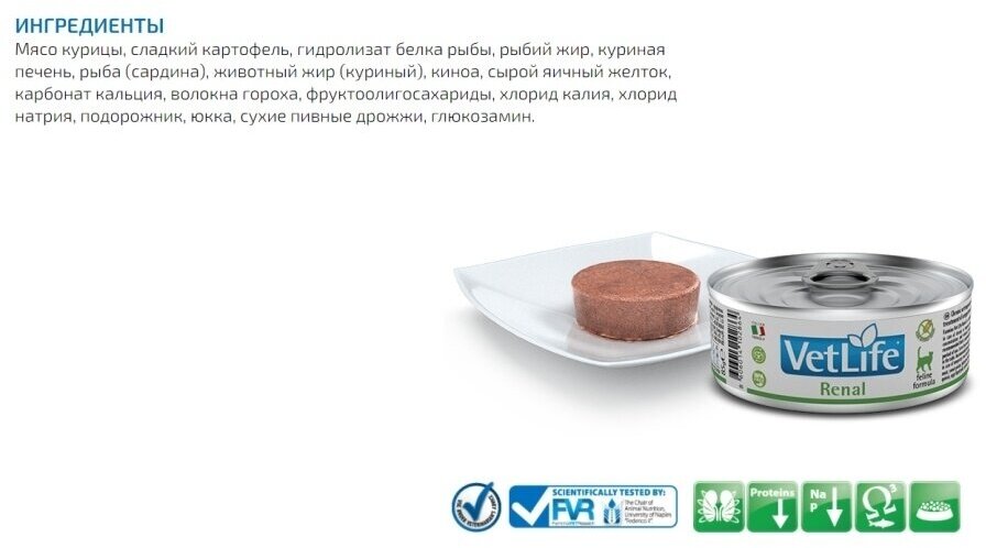 Почечная недостаточность/ вспомогательное средство в терапии застойной сердечной недостаточности.Farmina Vet Life Renal – диетический корм для кошек, разработанный для поддержания функции почек при почечной недостаточности. Диета содержит низкое количество фосфора и ограниченное количество белка.Механизм действия:Низкое содержание белка и фосфора снижают симптомы почечной недостаточности высокого качества и улучшают состояние животного.Рекомендации по кормлению:Использовать по назначению ветеринарного врача. Рекомендованные курсы лечения: 6 месяцев (2-4 недели в случаях временной почечной недостаточности). Рекомендуемая дневная норма кормления указана в таблице и имеет ориентировочный характер, необходимо точно установить вес кошки. Дневная норма может быть разделена на два и более кормлений. Кошка должна иметь свободный доступ к свежей питьевой воде.Сниженное содержание белка. Низкое содержание белка способствует снижению метаболизма азота и тормозит развитие гипертензии.Низкий уровень натрия и фосфора. Контроль гипернатриемии и гиперфосфатемии, что способствует замедлению прогрессирования почечной недостаточности.L-карнитин. L-Карнитин повышает толерантность к физической нагрузке.Омега-3. Полиненасыщенные жирные кислоты Омега-3 способствуют улучшению гломерулярной фильтрации.Высококачественные белки. Белки высокой биологической ценности профилактируют потерю мышечной массы.Все продукты Farmina разработаны специалистами и протестированы на собаках и кошках в домашних условиях содержания.