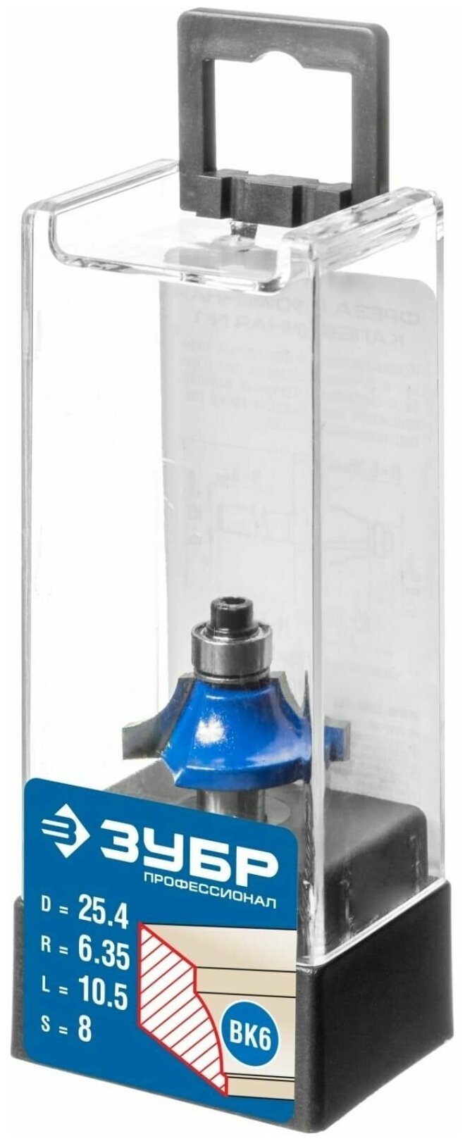 Фреза кромочная калевочная №1, D= 25,4мм, рабочая длина-10,5мм, радиус-6,35мм, хв.-8мм, d-9,5мм, ЗУБР Профессионал