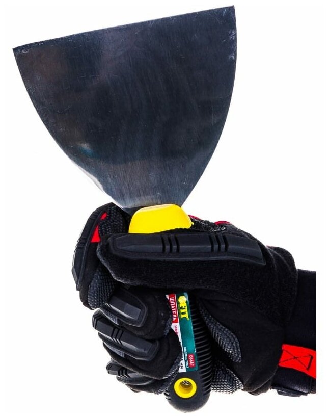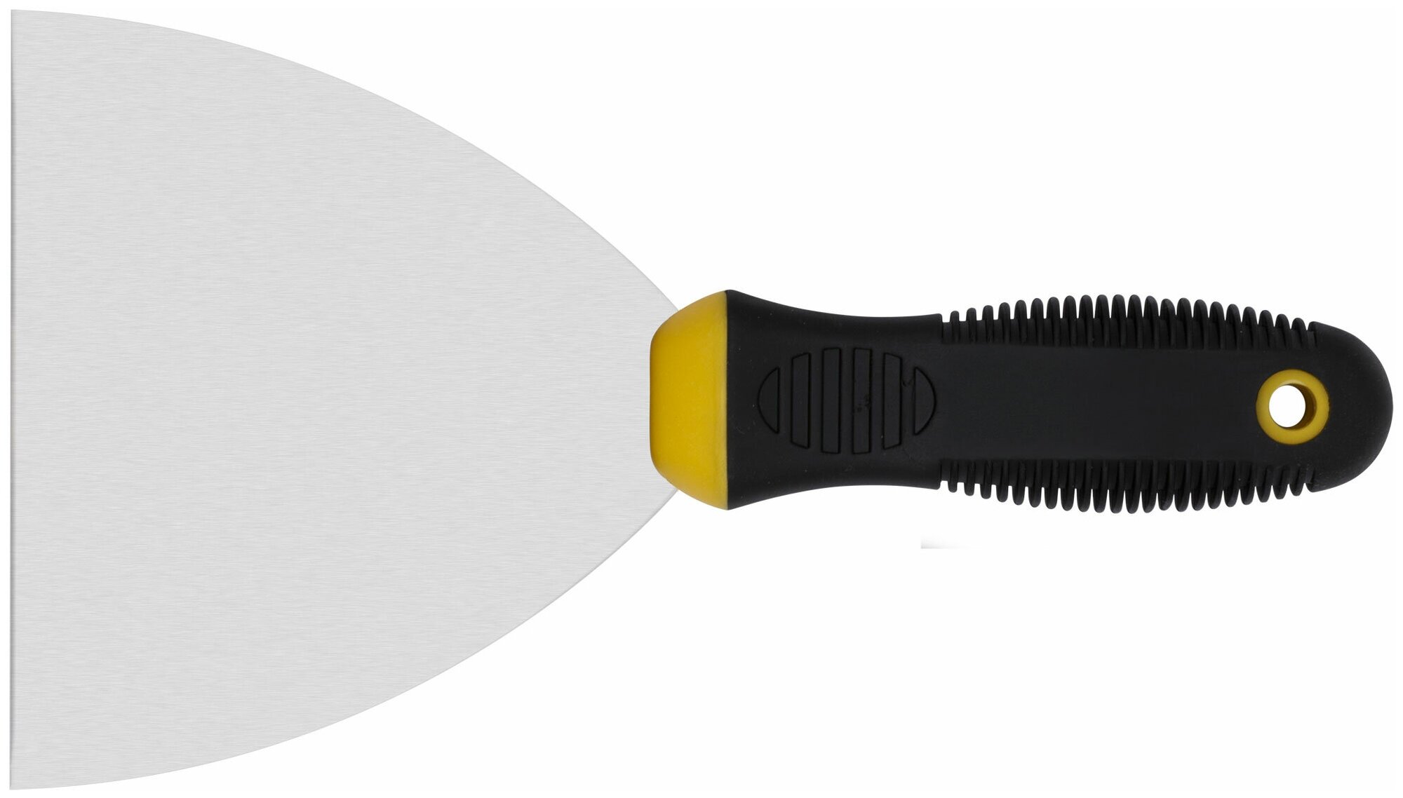 Шпатель 5" Fit с прорезиненной чёрно-жёлтой рукоятью применяется при работах с различными растворами.