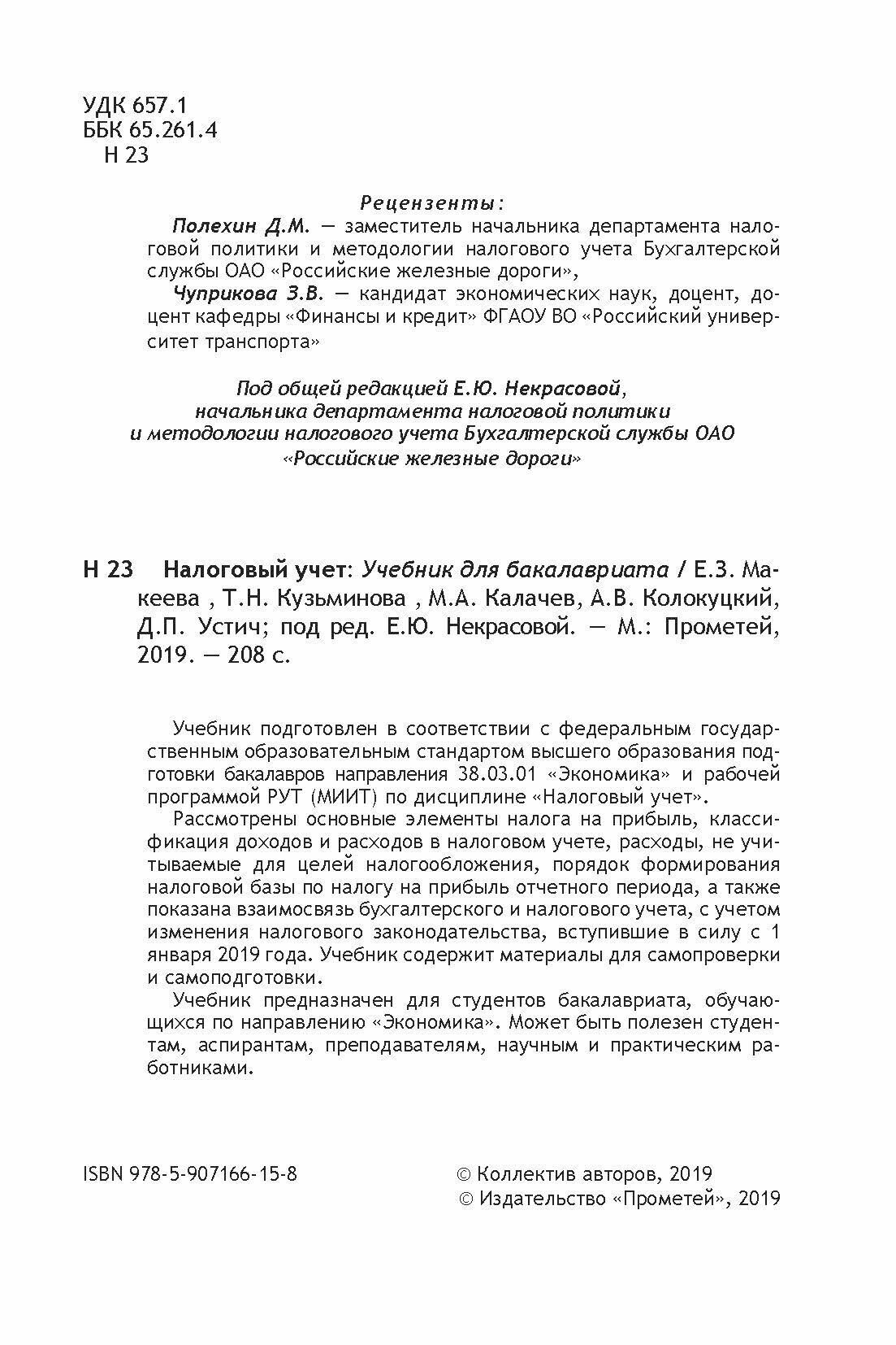 Учебник подготовлен в соответствии с федеральным государственным образовательным стандартом высшего образования подготовки бакалавров направления 38.03.01 «Экономика» и рабочей программой РУТ (МИИТ) по дисциплине «Налоговый учет».