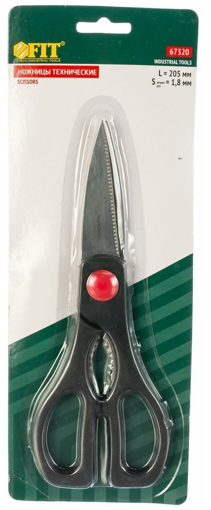 Технические ножницы FIT применяются для выполнения различных работ как в технических сферах деятельности, так и в быту: резки различных материалов, а также раскалывания чего-либо, например, орехов. Ножницы состоят из пластиковых рукояток и износостойких нержавеющих стальных лезвий.