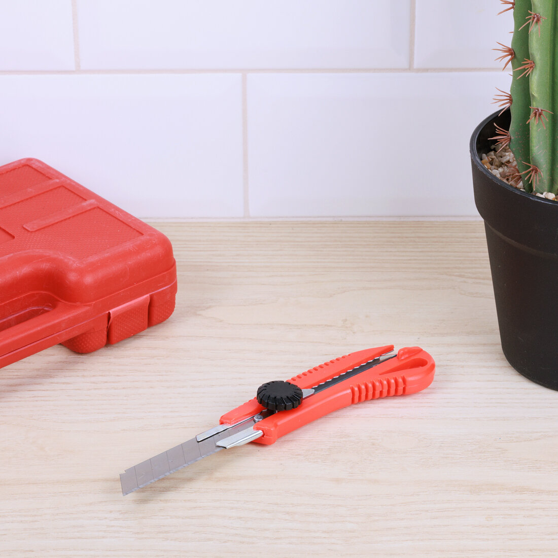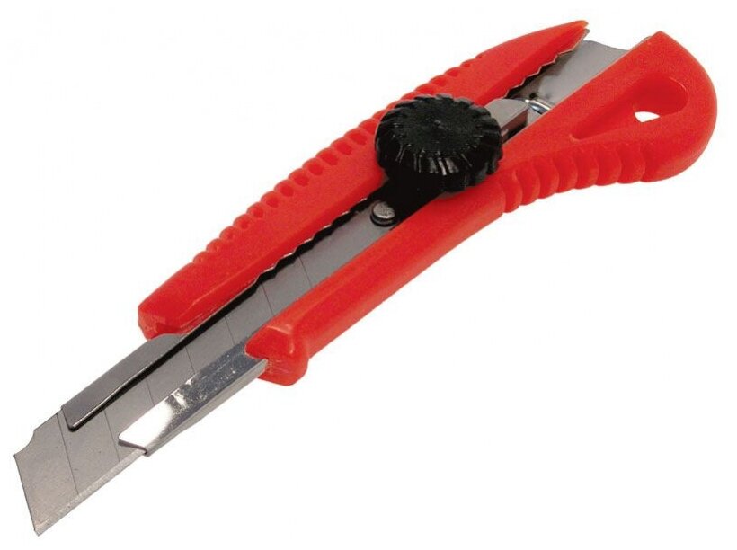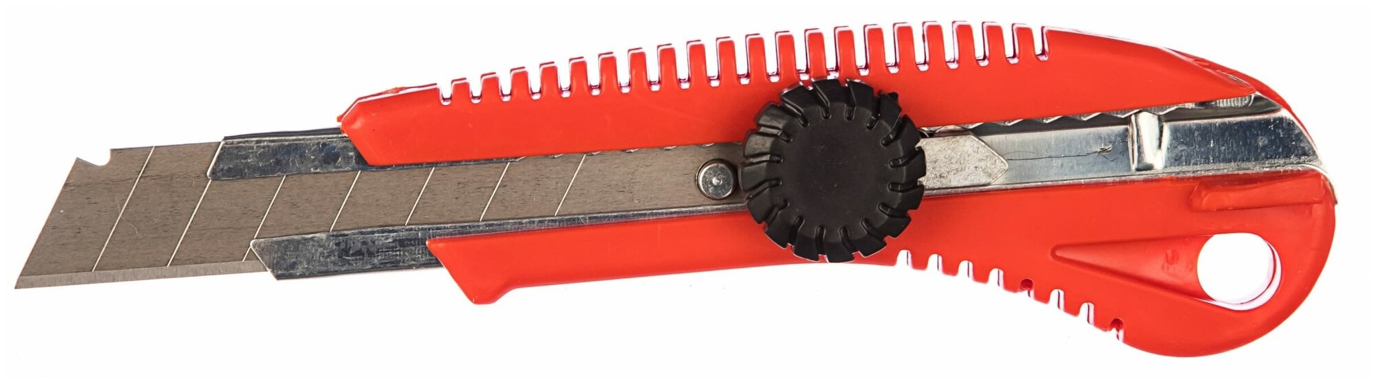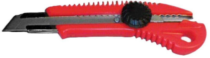 «Отламывающееся» лезвие с вращающимся пластиковым прижимом. Материал: корпус из пластика, усиленный металлической направляющей. Упаковка: п/э пакет с картонным подвесом.