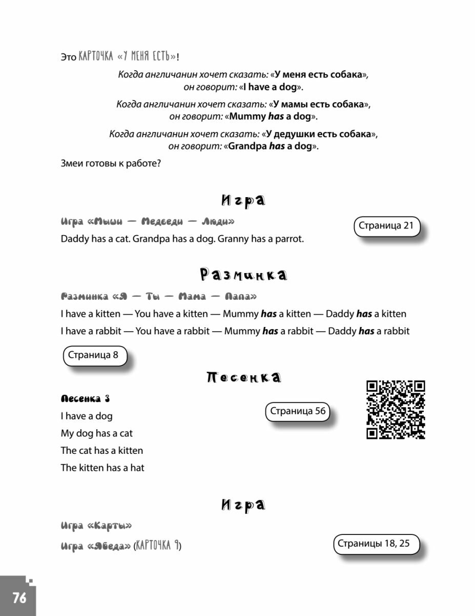В этой книге вас ждут новые игры, новые песенки, новые разминки и, конечно, новые мнемокарточки! Кроме того, все уроки сопровождаются аудиозаписями, которые вы сможете скачать, перейдя по ссылке или по QR-коду.