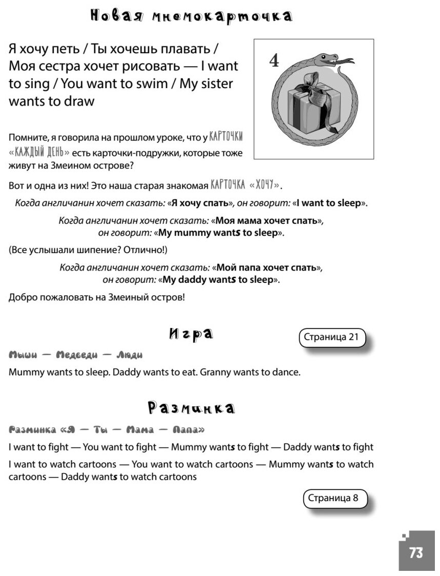 Занимаясь по урокам этого пособия вместе с ребенком, вы научитесь задавать вопросы в разных грамматических временах и отвечать на них, откроете тайну Змеиного острова, возьмете друг у друга интервью, сочините множество сказок, узнаете, во что превращает некоторые английские глаголы волшебная палочка, научитесь рассказывать о том, что произошло (и чего не произошло) вчера, и, конечно же, споете новые грамматические песенки и получите большое удовольствие.